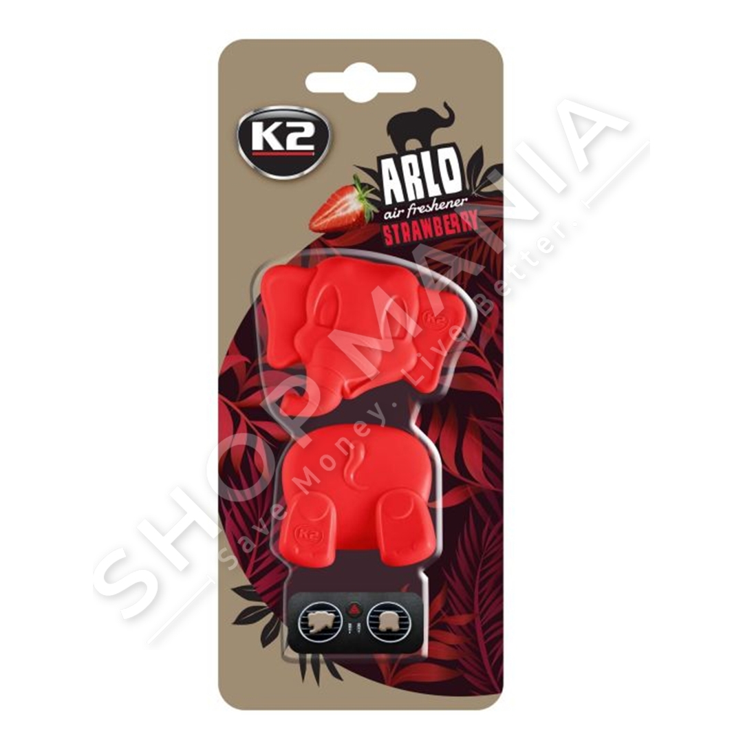 Air Freshener nga K2 Arlo eshte nje aromatik ne forme elefanti per makina qe vendoset tek grilat e ajrit te kondicionuar. Aromatiku i ajrit permban dy elemente kapese (koken dhe pjesen e pasme te elefantit). Nuk le njolla ne duar, dhe eshte i sigurte per te gjitha plastikat dhe lekuren.