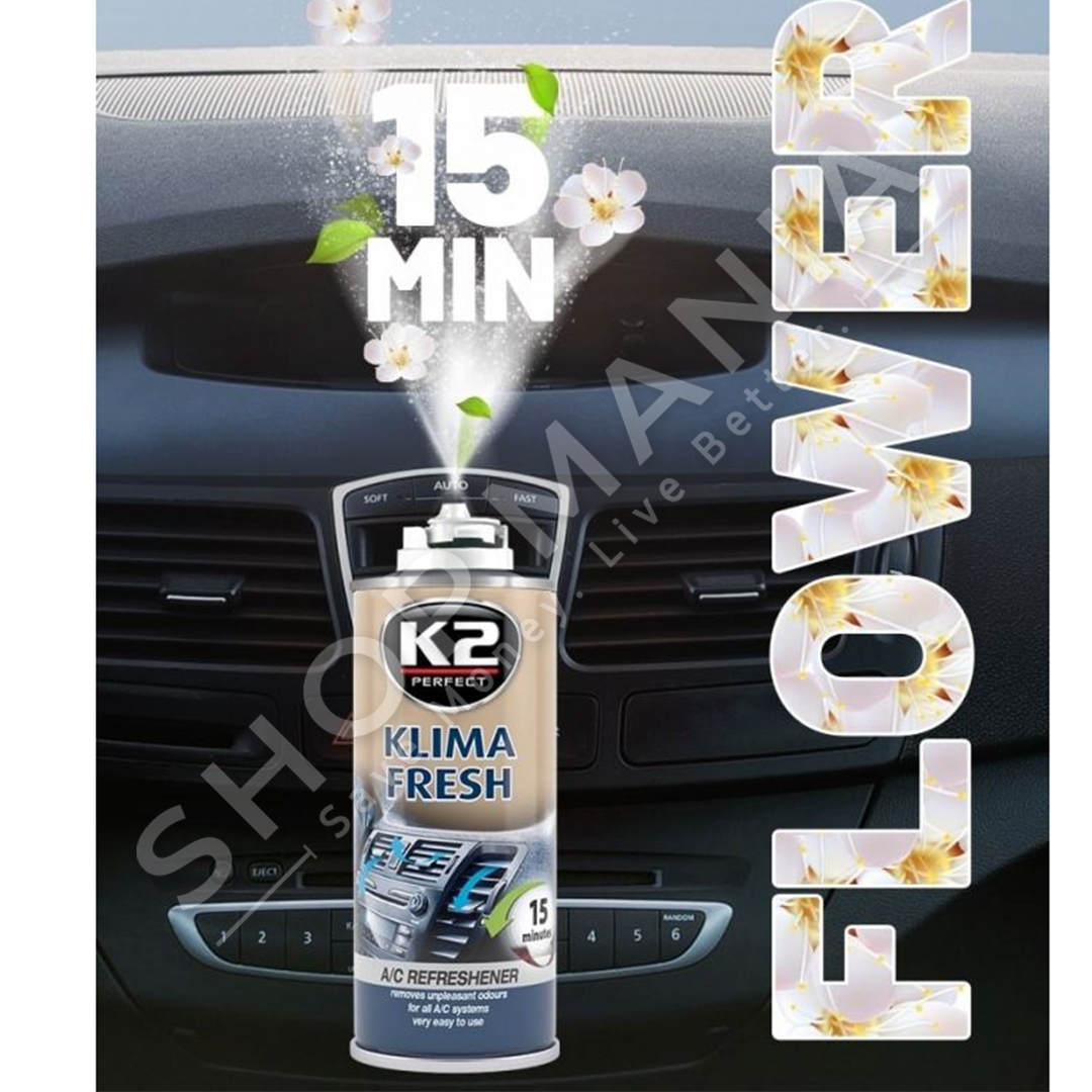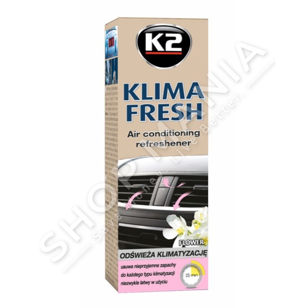 K2 KLIMA FRESH eshte nje aromatizues kondicioneri efektiv dhe i lehte per t’u perdorur. Heq aromat e pakendshme qe krijohen si rezultat i papastertise dhe lageshtise ne sistemin e ventilimit. I gjithe procesi nuk zgjat me shume se disa minuta. I pershtatshem per te gjithe llojet e kondicionereve. Le nje arome te fresket pas perdorimit.