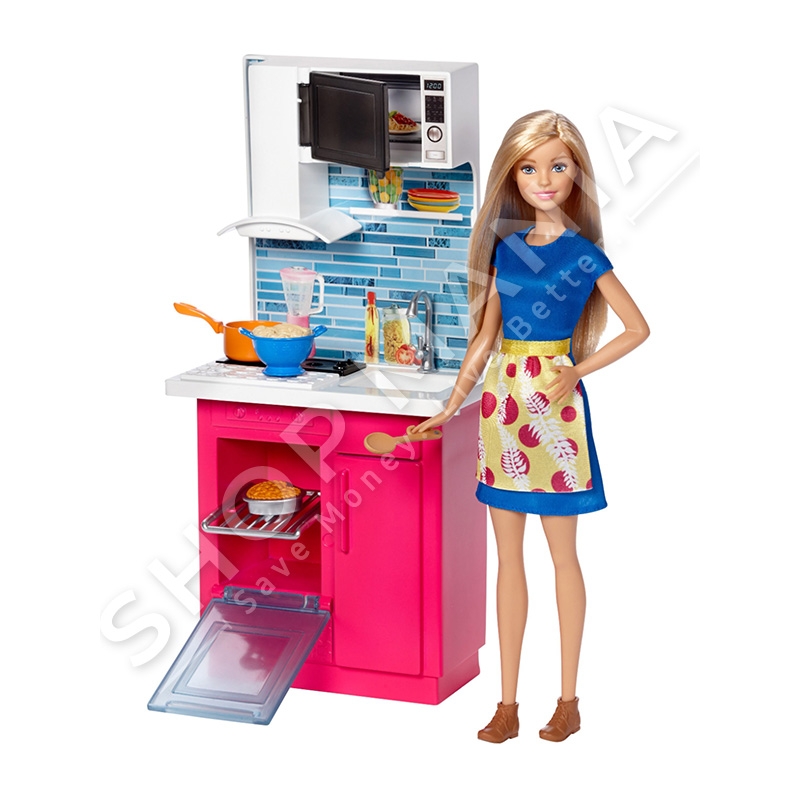 Nje set i bukur i kukulles Barbie me kuzhinen e saj te embel dhe te ngrohte te dizenjuar ne ngjyre roze, te bardhe dhe blu. Kukulla Barbie, vjen me nje fustan blu dhe cizme kafe. Me nje mikrovale dhe lavaman, ku mund te pergatise makarona duke perdorur ene te tjera si tenxhere dhe luge druri, ose te pjeke embelsiren e saj te preferuar me zemra ne furren e vogel. Femijet mund te eksplorojne lojen ne shtepi me kete lloj koleksioni te mobiljeve dhe kukullave. Kjo gje do t'i ndihmoje shume te krijojne dhe ndertojne historite e tyre te vecanta me teme kuzhinen. Specifikat:
