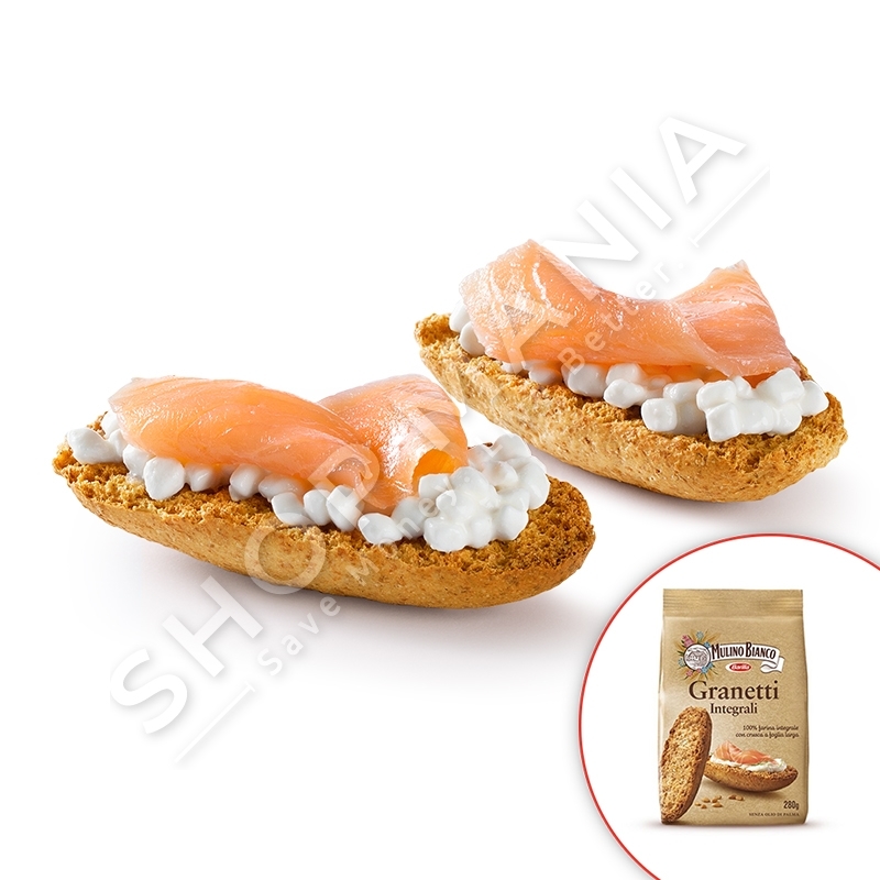 Ju sugjerojme nje meze te lehte me 2 graneta integrale, shoqeruar me salmon dhe pak djathe te fresket, ju siguron nje marrje kalorish prej rreth 176Kcal, e barabarte me 9% te energjise ditore te nevojshme.