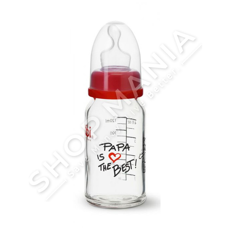 Përshkrimi: Bibi sjell per ju shishen e qelqit me gryke te ngushte me biberon silikoni ne forme dentale me detaje te kendshme " I love mama" dhe " Papa is the best" qe ju te zgjidhni cilen te deshironi.