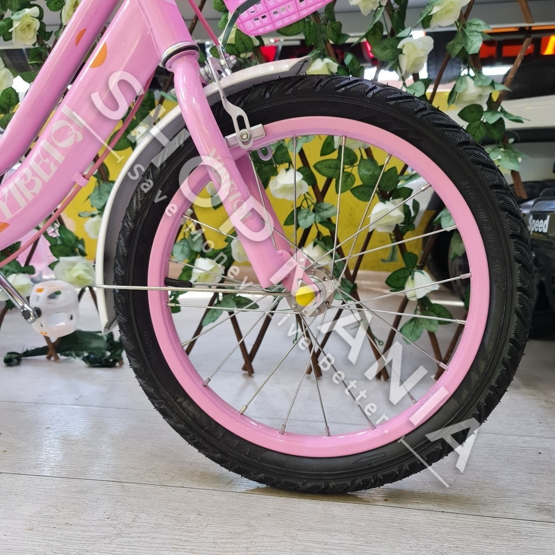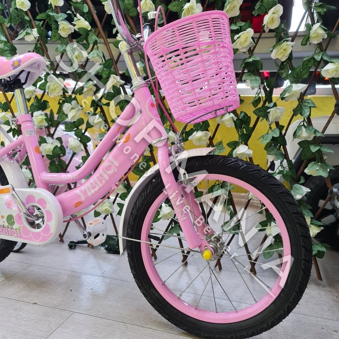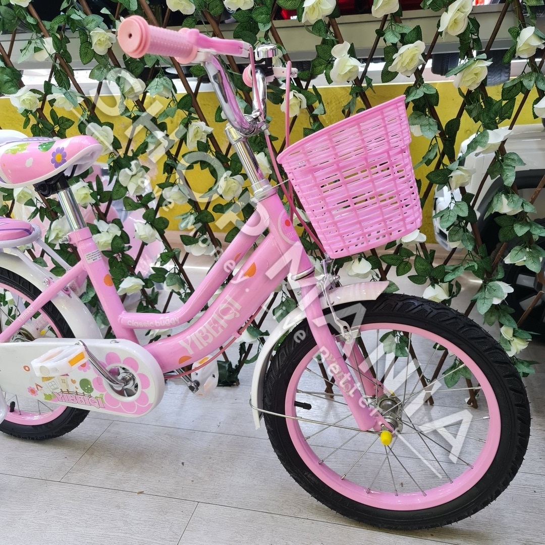 Përshkrimi: Biciklete 16'' per vajza nga mosha 4-9 vjec.. Me strukture dhe disqe celiku me goma me ajer. Kjo biciklete vjen me rrota ndihmese per ta bere me te lehte guidimin nga femijet ne fazat e para. Gjithashtu ka nje kosh ne pjesen e perparme per te vendosur lodra ose sende te ndryshme. Shala eshte me mbushje te dyfishte per rehati maksimale te femijeve. Me skare ne pjesen pasme e pajisur me nje ulese te bute lekure me mbushje. Timoni ka nje gjatesi te pershtatshme sipas standarteve europiane me doreza silikoni te buta per duart delikate te femijeve