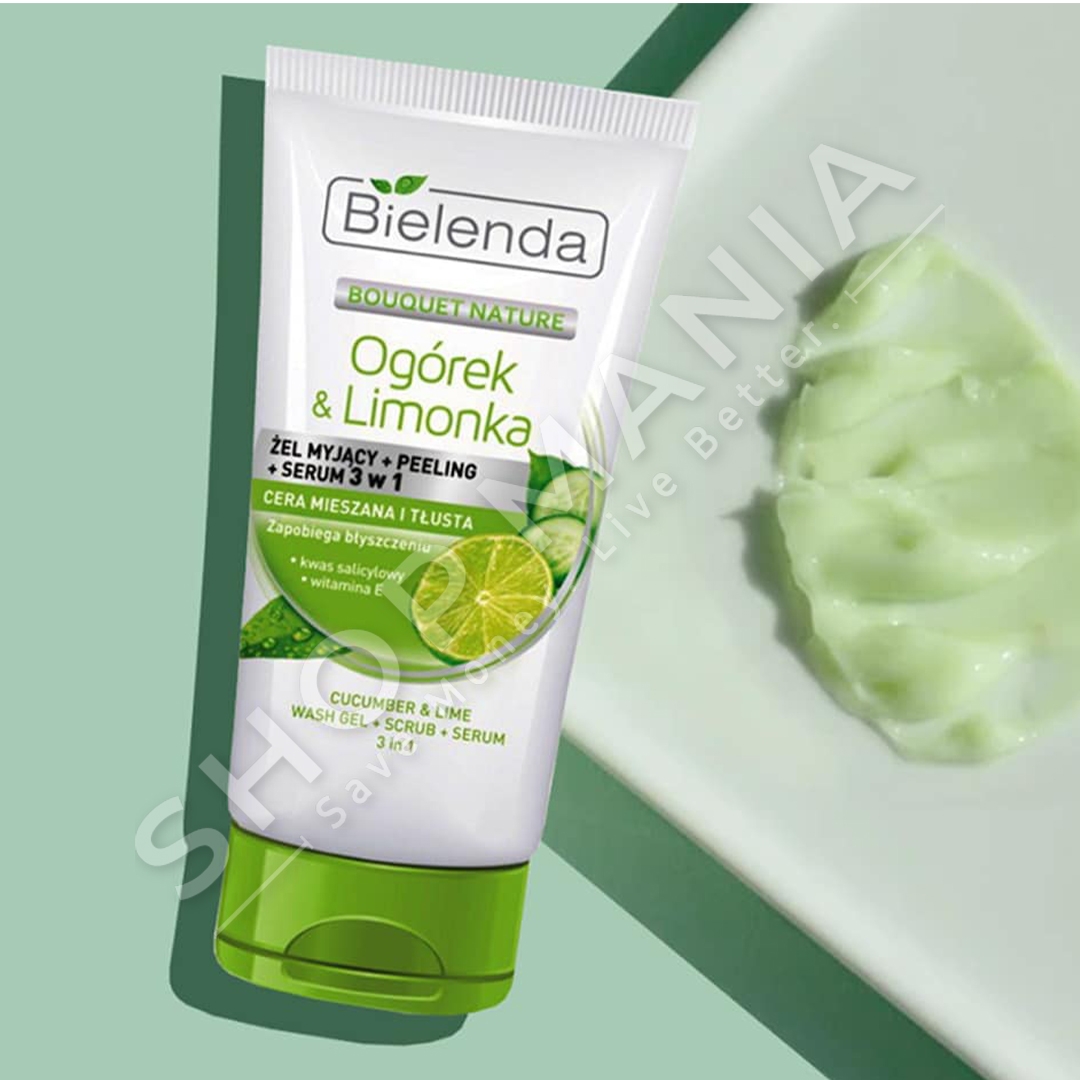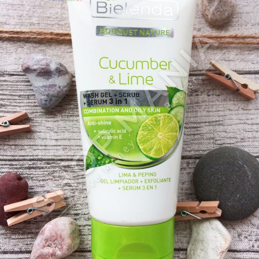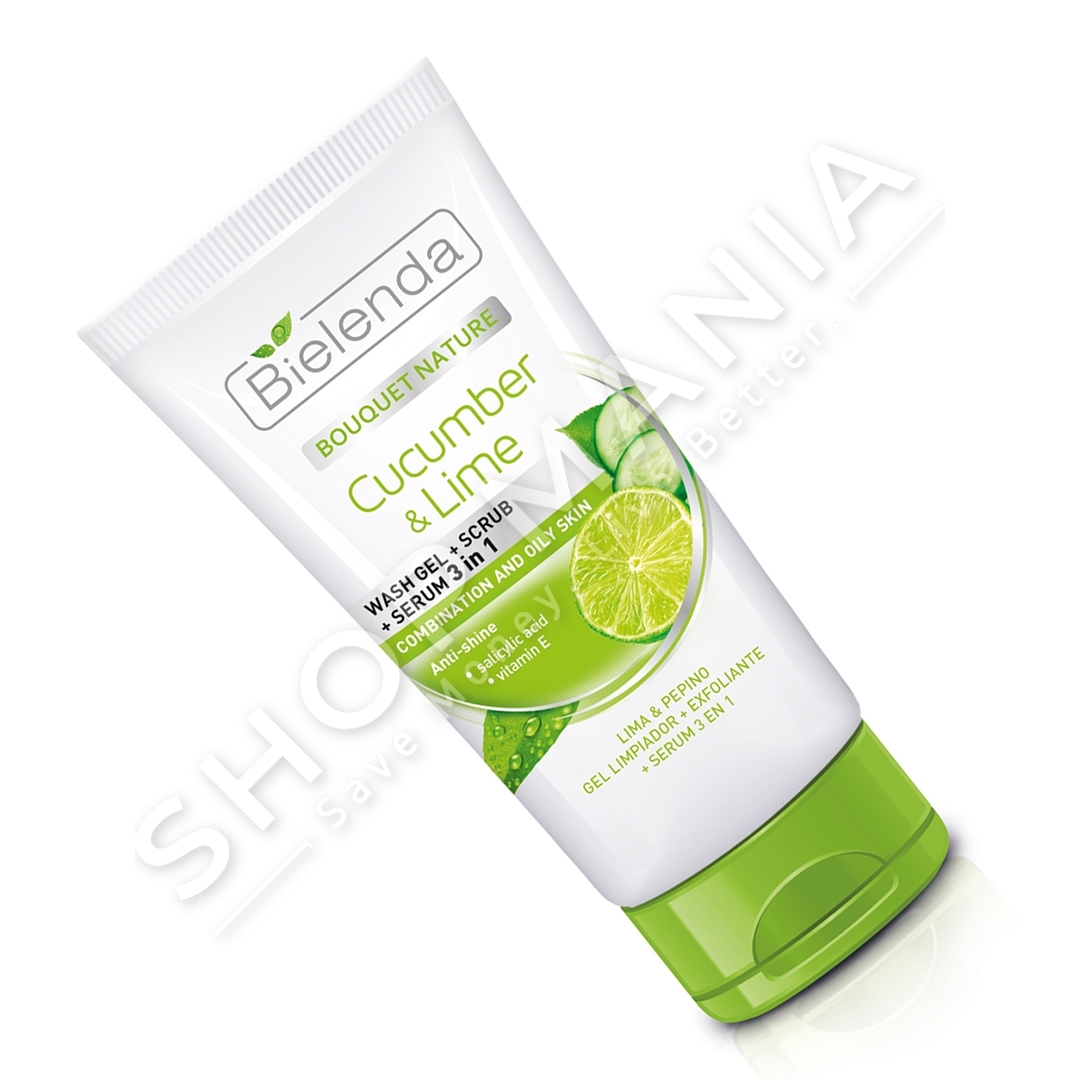 Xhel pastrues 3 ne 1 ideal per lekure te kombinuar dhe te yndyrshme, zbut acarimin dhe aknet, hidraton dhe nuk e than lekuren. Produkti mund te perdoret si xhel lares, pastrim (scrub) dhe serum. Gel pastron teresisht, freskon, heq grimin dhe yndyren e tepert. Peeling pastron butesisht lekuren dhe pastron poret e bllokuara. Serumi e ben lekuren matt dhe rregullon ngjyren e lekures. Permban kastravec dhe lime, te cilat ne menyre perfekte hidratojne lekuren duke lene nje arome te kendshme.
