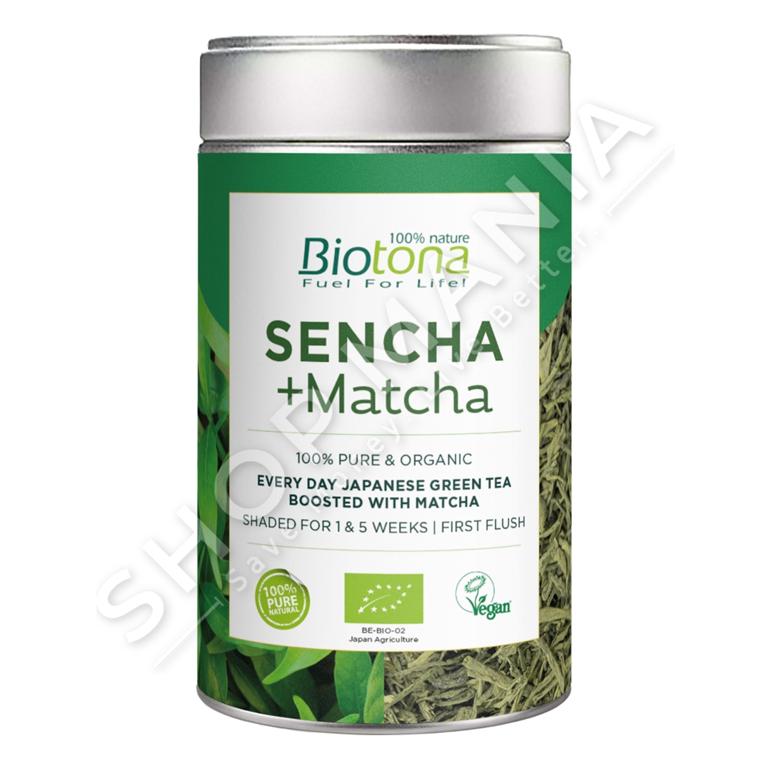 Biotona Bio Sencha + Matcha eshte nje perzierje e çajit jeshil japonez te lirshem dhe nje pluhuri qe kombinon ne menyre perfekte shijet e sencha dhe Matcha. Sencha eshte nje çaj jeshil i perditshem me nje shije te embel por pak te hidhur.