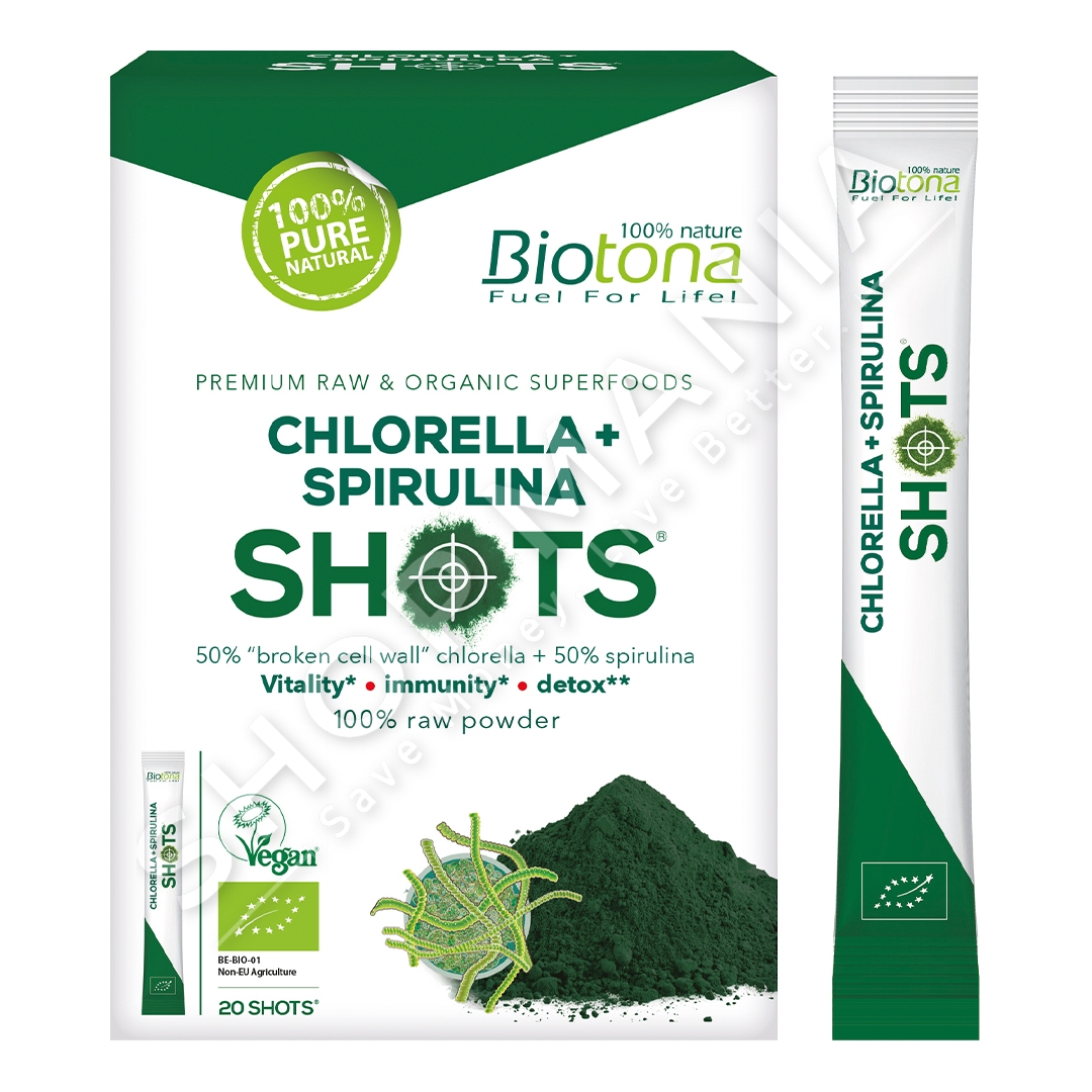 Biotona BIO Chlorella + Spirulina e paperpunuar, perkatesisht nje alge e gjelber e ndezur njeqelizore e ujerave te embla dhe nje alge detare, nxisin vitalitetin dhe rezistencen natyrore.