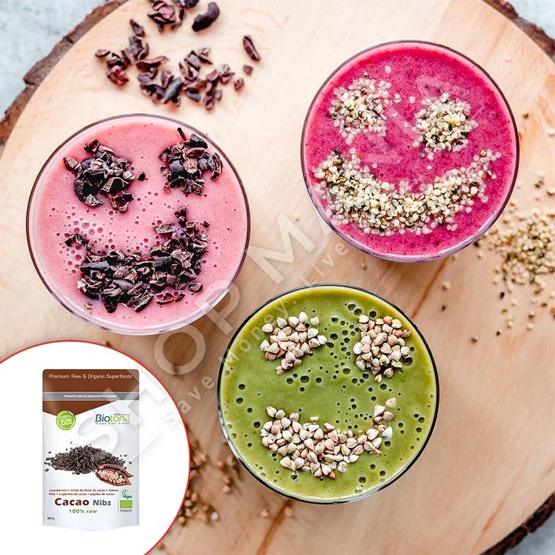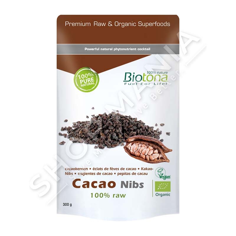 Biotona Bio copeza Kakao perftohet nga nje grirje e thjeshte e forte e kokrrave te thara ne diell dhe te fermentuara ne menyre organike te Kakao Criollo. Ky proces rezulton ne copeza te shijshme krokante kakaoje. 100% e paster dhe natyrale pa shtesa dhe me permbajtje natyralisht te ruajtura te se gjithe fitonutrienteve. Specifika:
