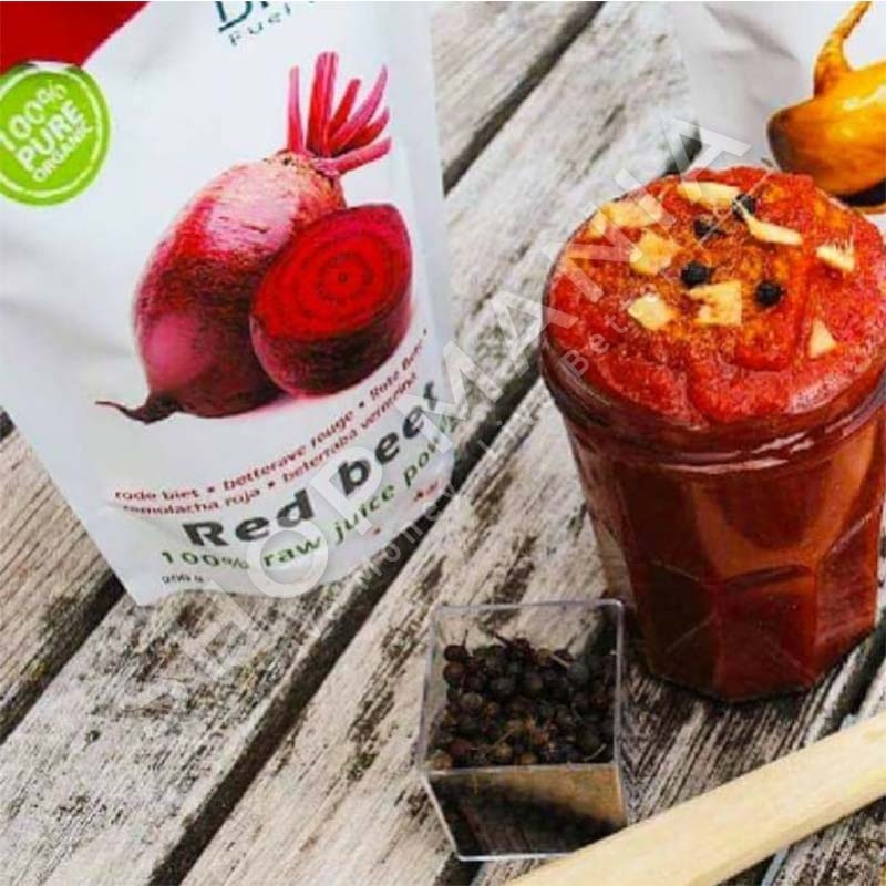 Ngjyra e kuqe ne lejla e produktit vjen nga rritja organike 100% e panxharit te kuq.