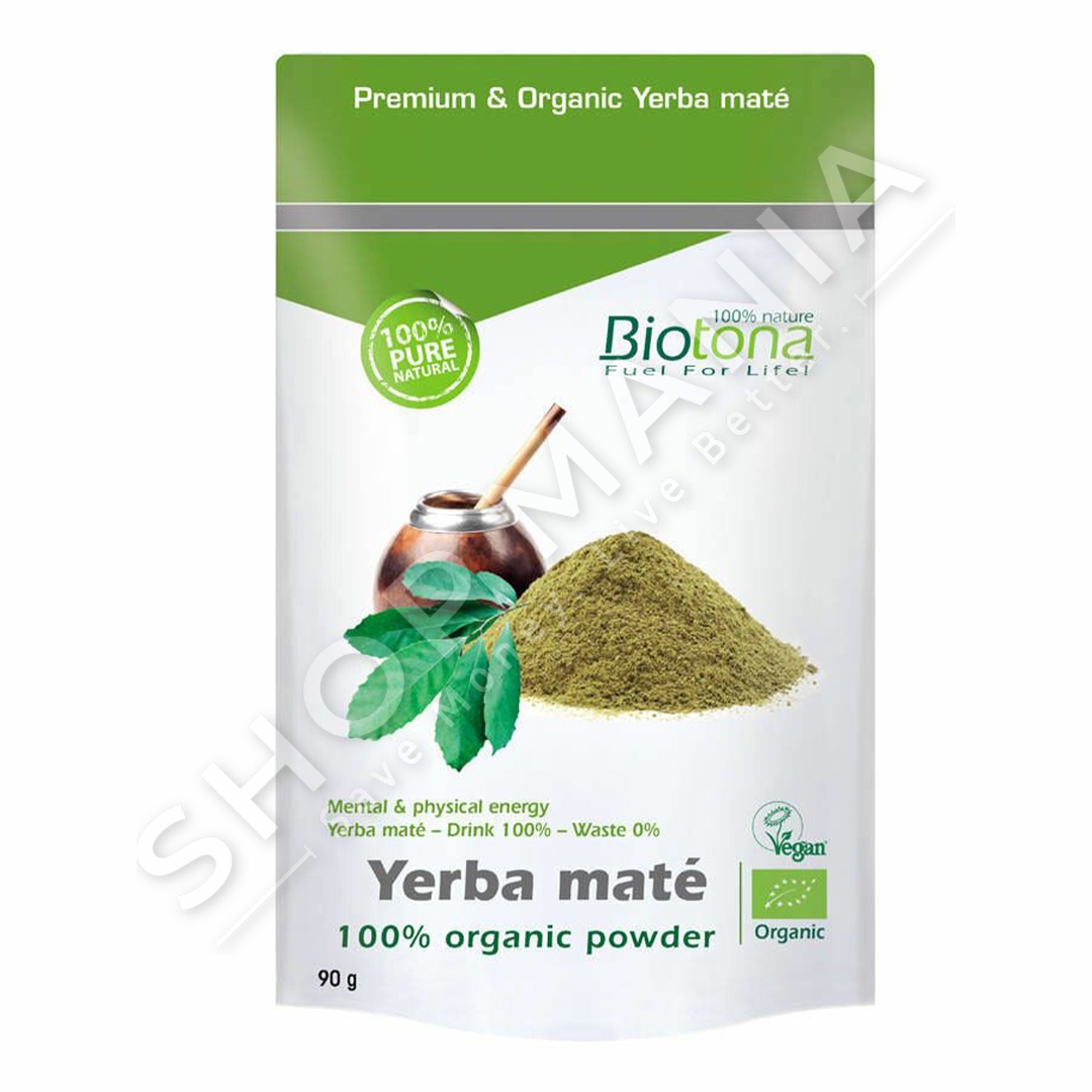 "Biotona YERBA MATÉ 100% organic powder — 90 g" eshte suplementi i duhur per energji mendore dhe fizike.