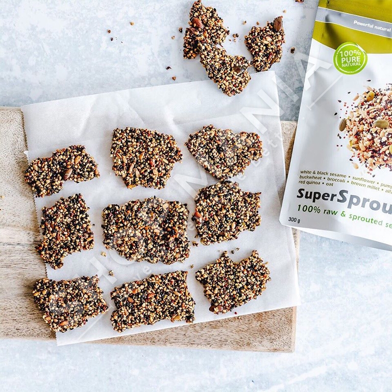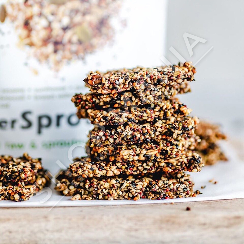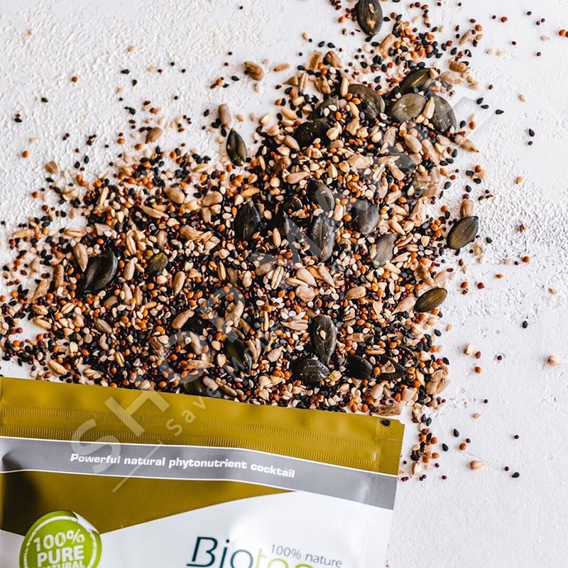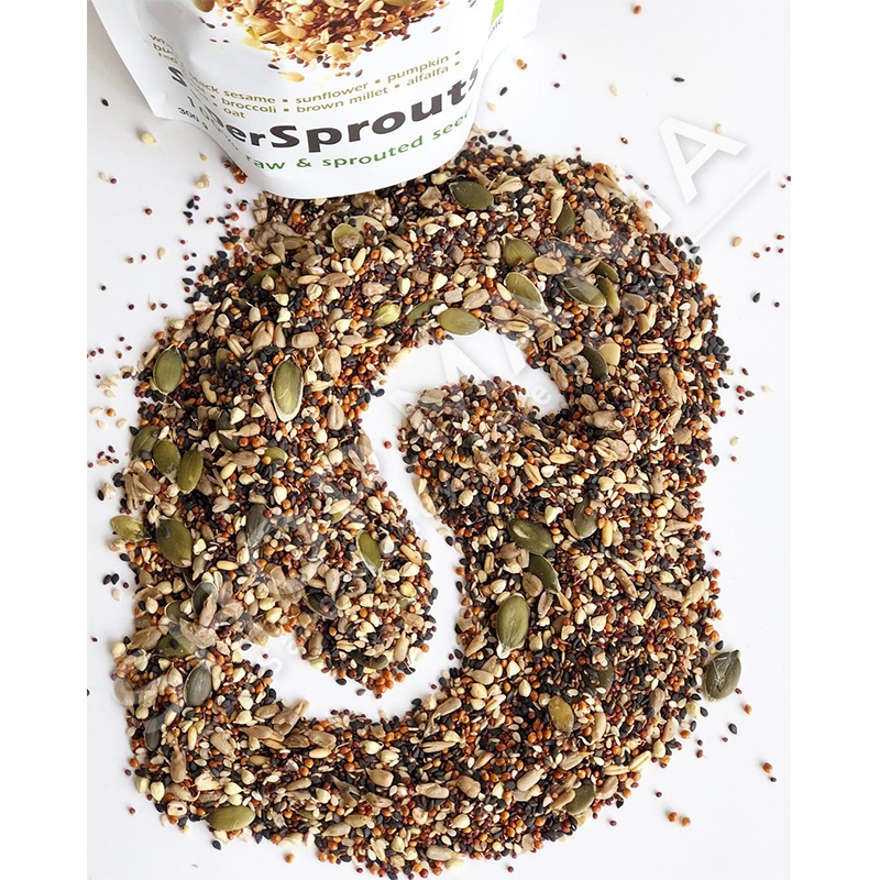 seeds of: white sesam* and black sesam*, sunflower*, pumpkin*, buckwheat*, broccoli*, brown millet*, alfalfa*, red quinoa* and oat*.(Sesamum indicum, Helianthus annuus, Cucurbita pepo, Fagopyrum esculentum, Brassica oleracea, Panicum miliaceum, Medicago sativa, Chenopodium quinoa, Avena sativa)