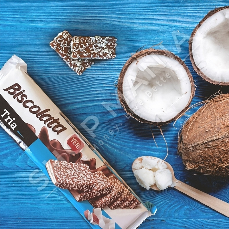 Biscolata sjell per ju biskota vafer te mbushura me cokollate te bardhe dhe are kokosi per t'ju ndjere te lumtur ne cdo moment te dites.