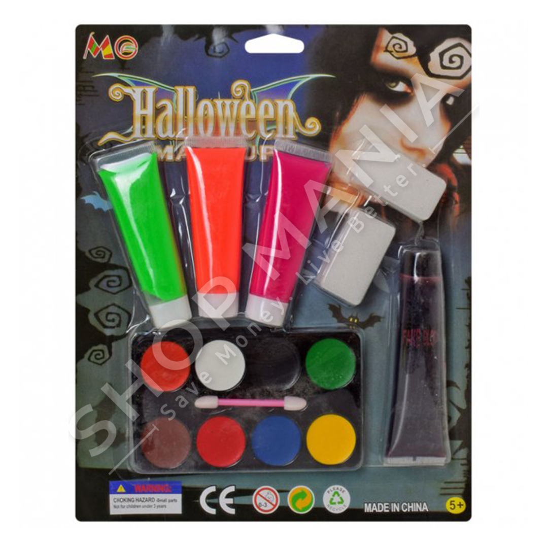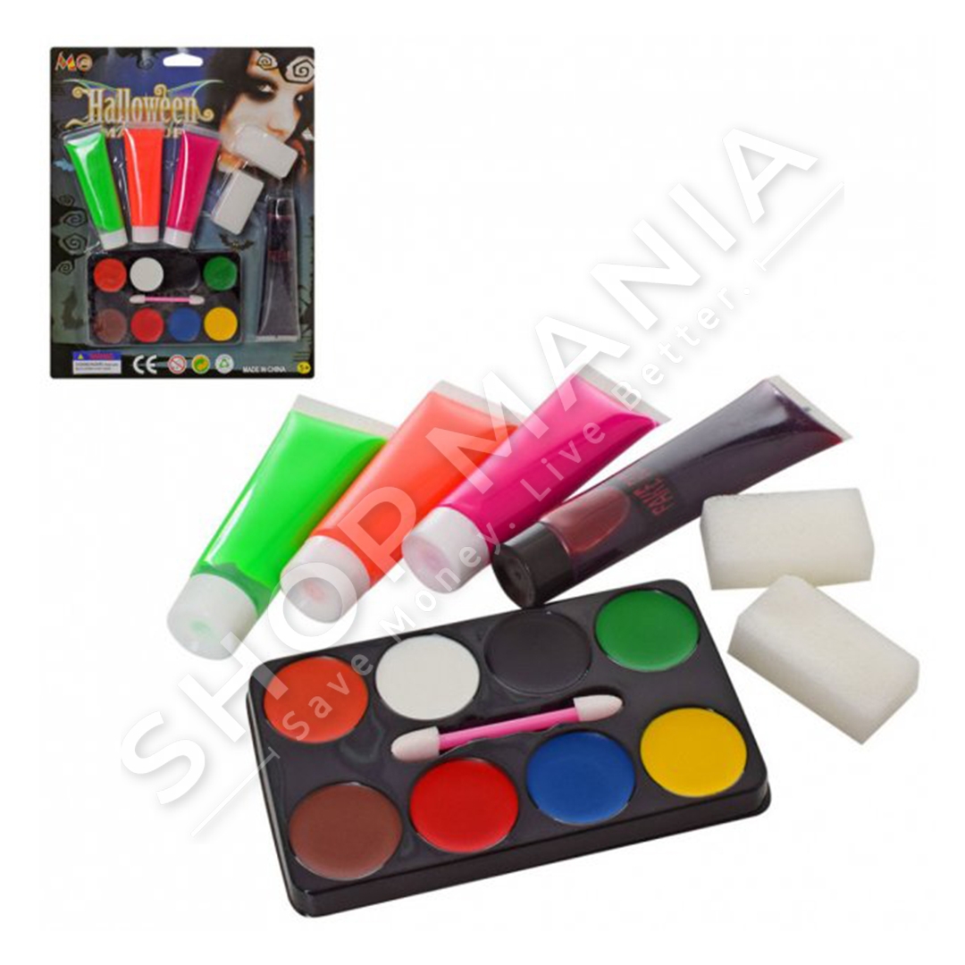 Paketimi permban 3 bojera ne ngjyra te ndryshme, nje palete me 8 ngjyra, dy sfungjer perhapes dhe 1 boje Fake Blood.