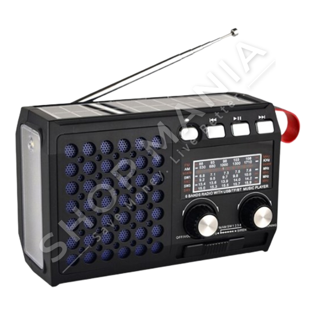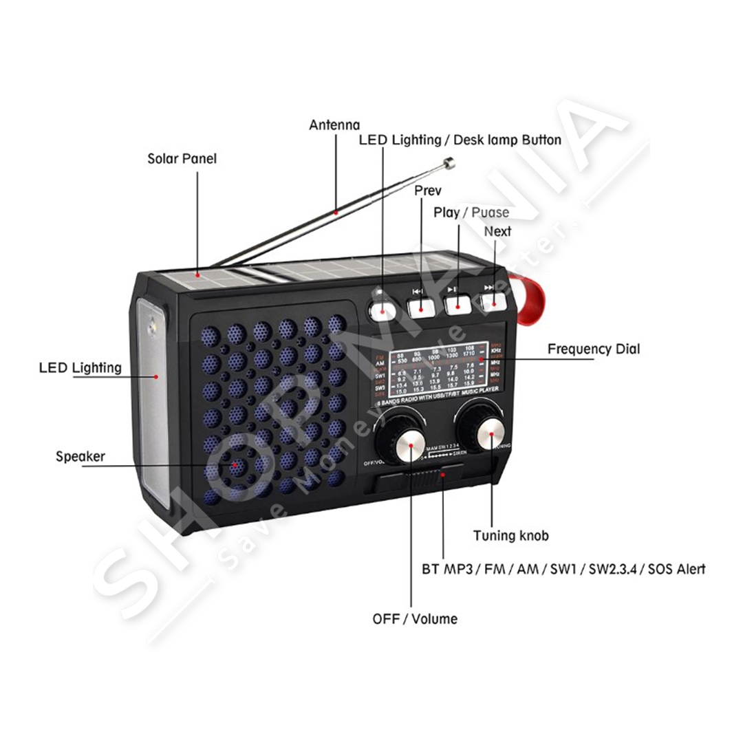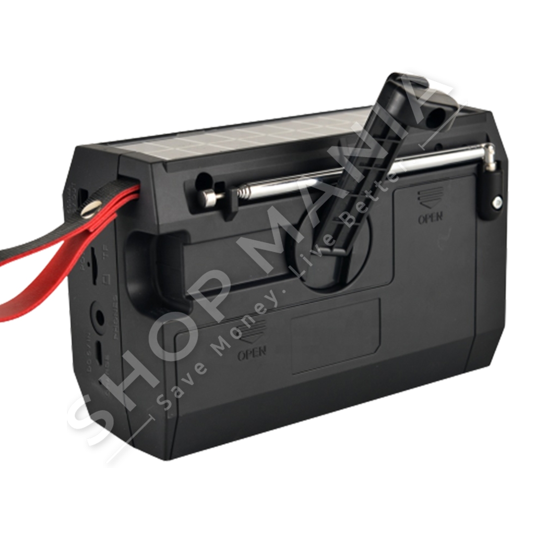 Me 5 menyra karikimi: nepermjet panelit diellor Solar Power, nepermjet Hand Crack Power, USB charge, nepermjet baterise 1200 mAh (te perfshire) dhe baterive R20 (qe nuk perfshihen).