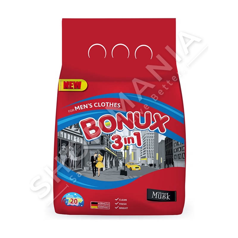 Detergjenti pluhur Bonux Vibrant Musk perdoret kryesisht per larjen e rrobave me ngjyre te meshkujve dhe eshte i pershtatshem si per veshje pambuku ashtu edhe per ato sintetike.