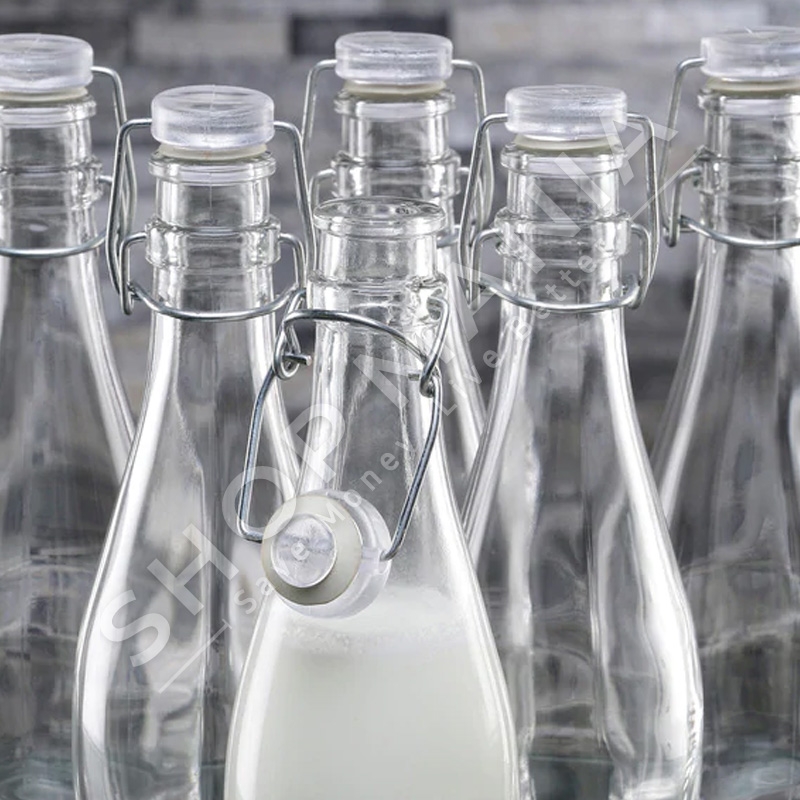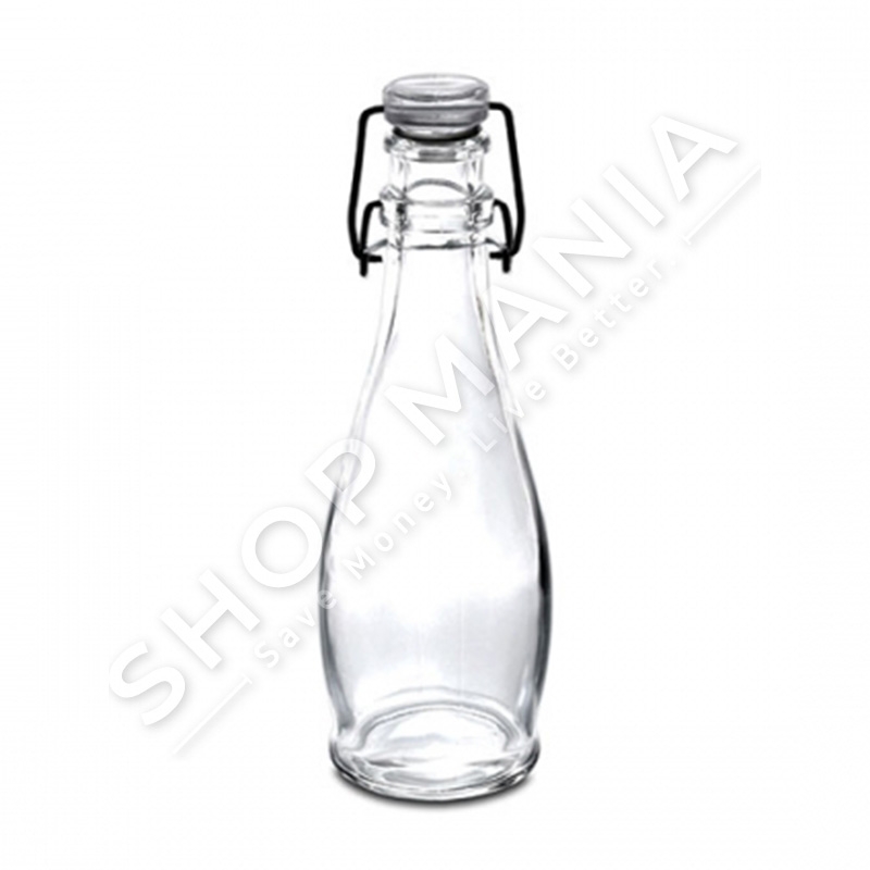 Shishe transparente prej qelqi 355 ml, me tape te bardhe, te mbyllur hermetikisht “Indro”, nga Borgonovo.