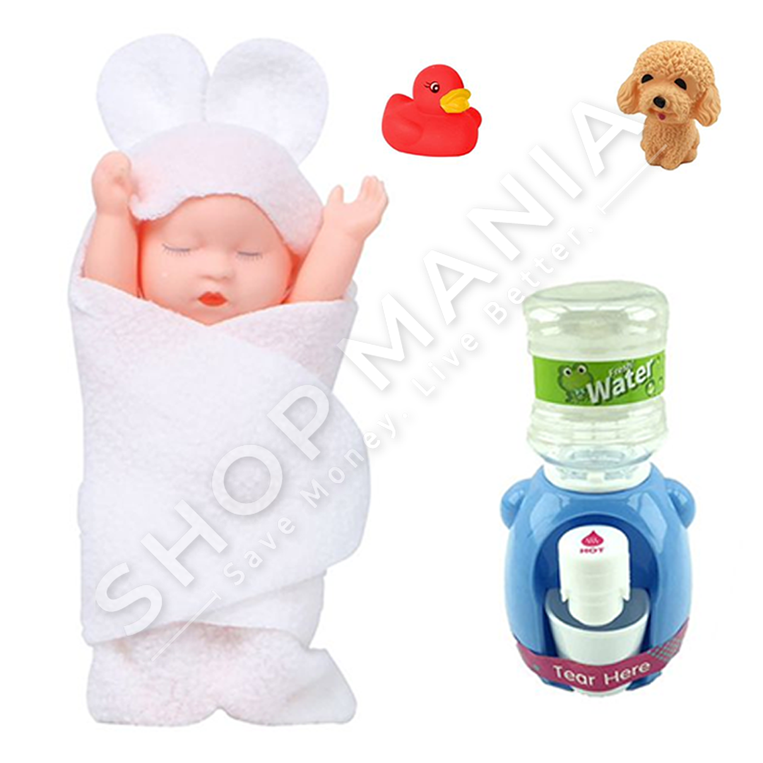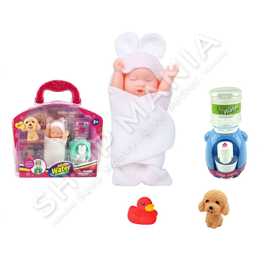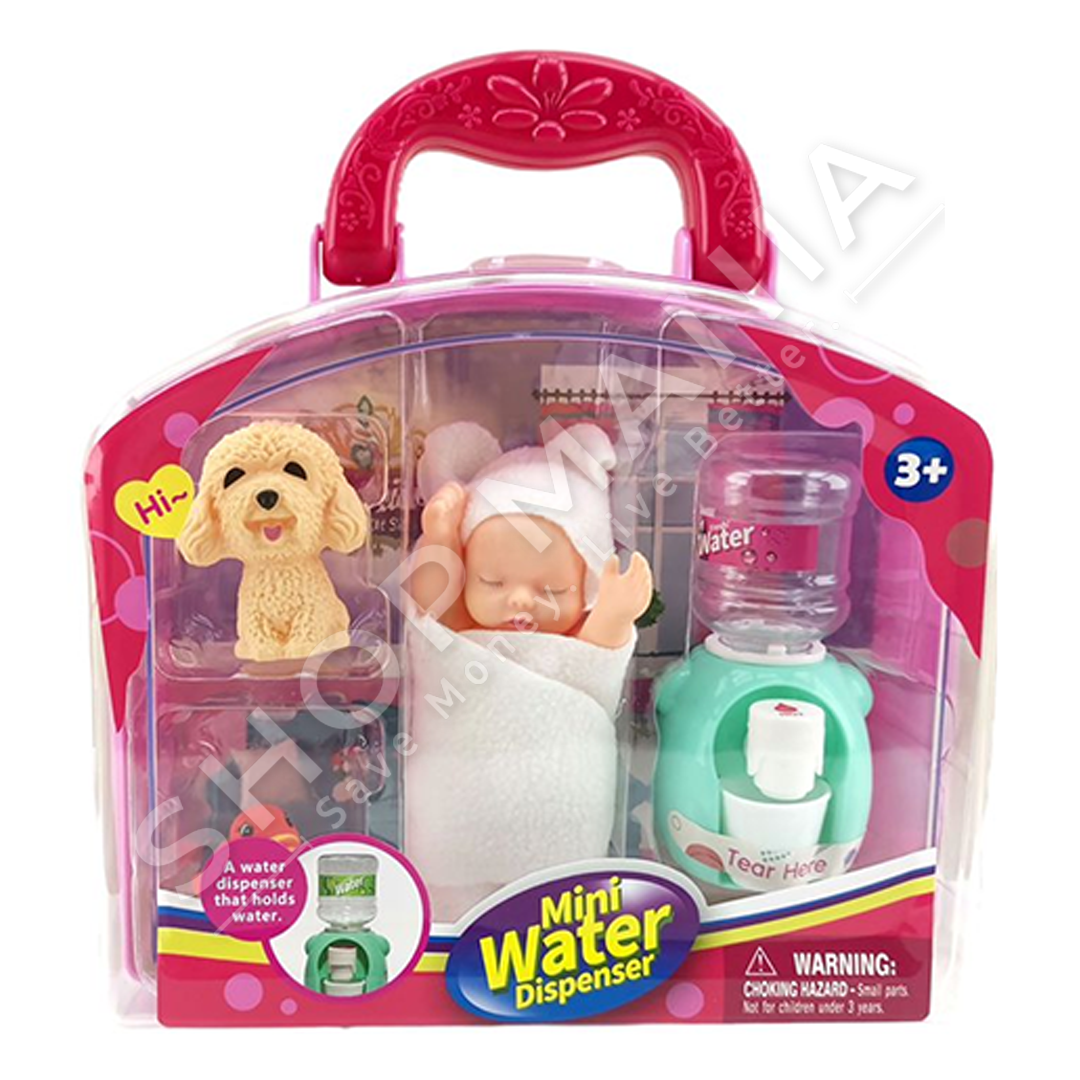 Ne cante perfshihet nje dispenser uji, nje bebe e vogel e mbeshtjelle me peshqire, nje qenush dhe nje rosak.