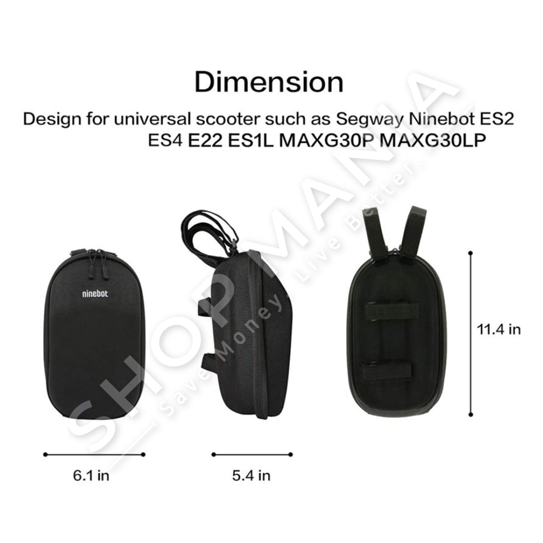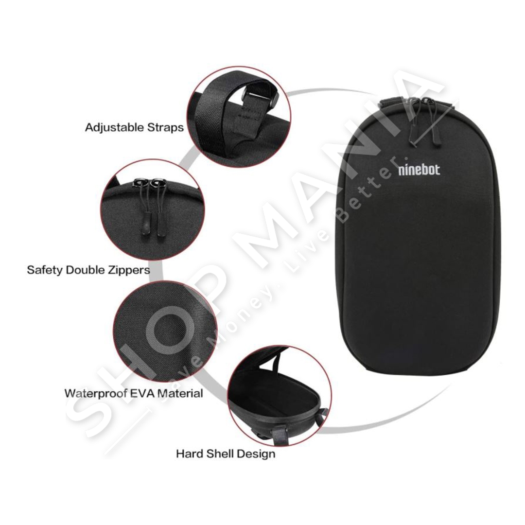 Cante per Scooter Nineboot rezistente ndaj ujit, pluhurit dhe papastertive. Vendoset lehtesisht ne timonin elektrik te skuterit dhe eshte ne perputhje me te gjithe skuterat Nineboot dhe me nje shumice te tjere skuterash elektrike. Ne te mund te merrni gjithcka qe ju duhet si smartphone, kuleten, powerbank, karikues dhe sendet tuaja personale. Kellefi i saj mund te rregullohet ne gjatesi dhe gjeresi, si dhe rripat, keshtu qe mund te shnderrohet ne cante dore ose cante shpine.