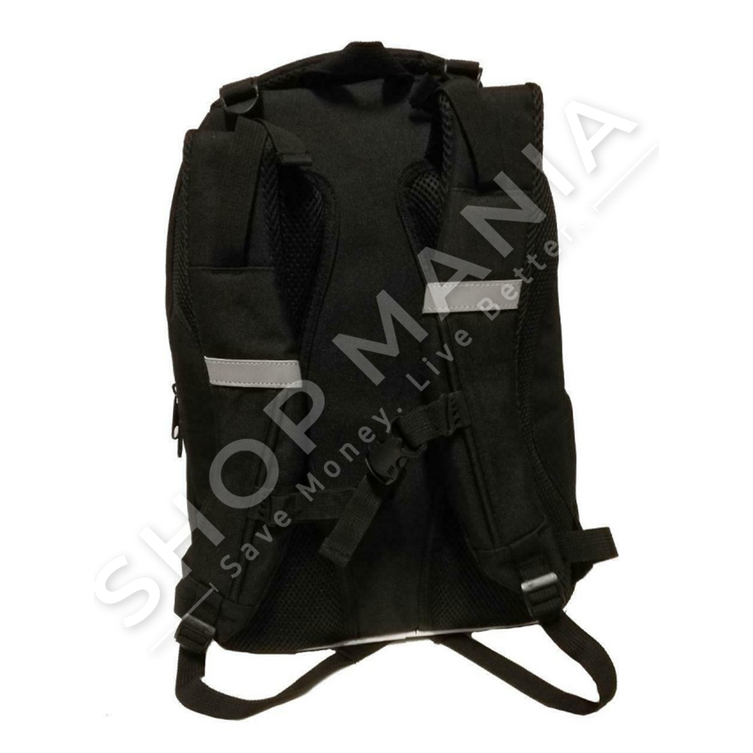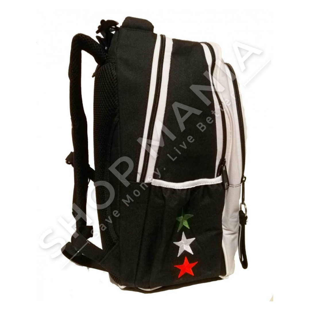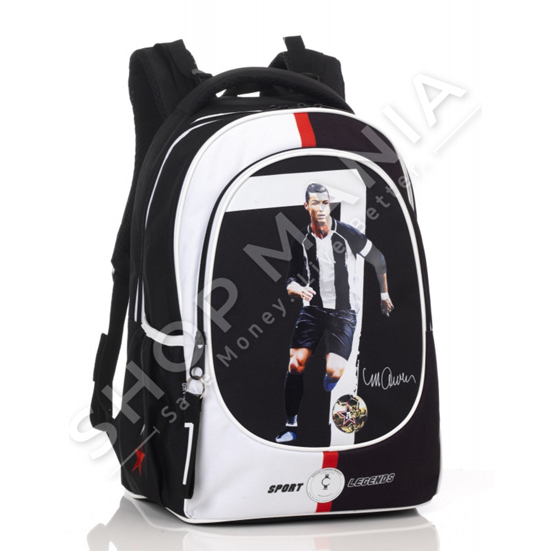Cante shkolle ne ngjyre te zeze dhe te bardhe me foton e futbollistit Christiano Ronaldo. Me nje xhep te madh per librat dhe fletoret dhe me dy xhepa me te vegjel ne pjesen e perparme per te vendosur mjetet dhe artikuj te tjere shkollore. Me rripa te rregullueshem me sfungjer qe nuk vrasin shpatullat dhe me xhepa anesore per te vendosur shishen e ujit.