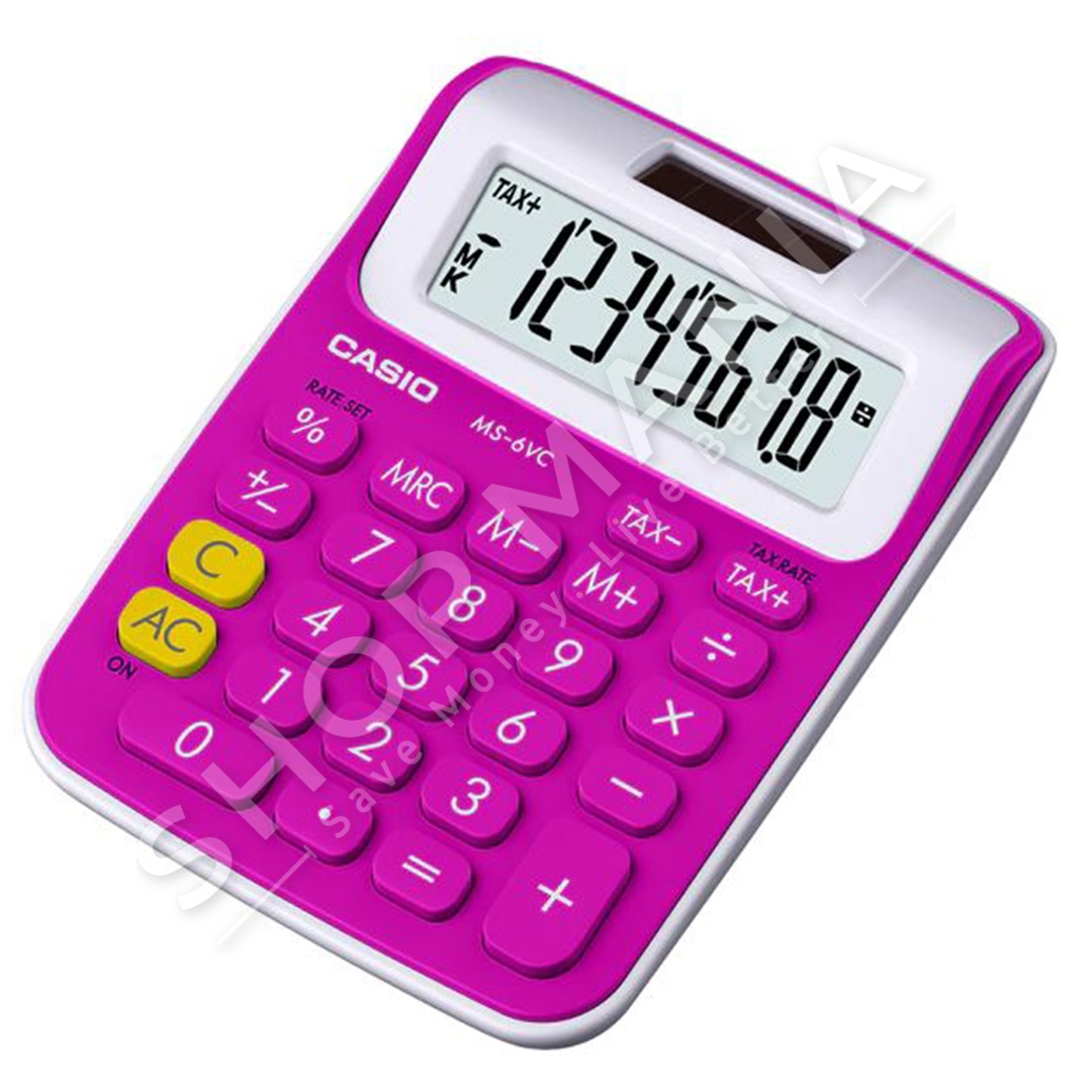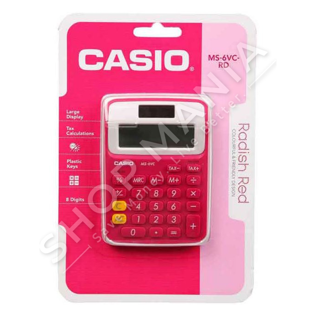 Makine llogaritese Casio MS-6VC-RD me ekran te madh, te lehte per t'u lexuar. Me opsionet e llogaritjes se cmimit plus taksen, cmimin minus tatimin, zbritjen, cmimin e shitjes, shumen e takses, shumen e zbritjes dhe shumen e marzhit. Nje simbol +, -, ×, ÷ ne ekran ju tregon statusin e operacionit qe po kryeni aktualisht. Tasti "" %"" jep qasje te shpejte ne cmimet dhe fitimet, dhe gjithashtu jep shtesa, zbritje, raporte dhe rritje/ulje te vlerave.