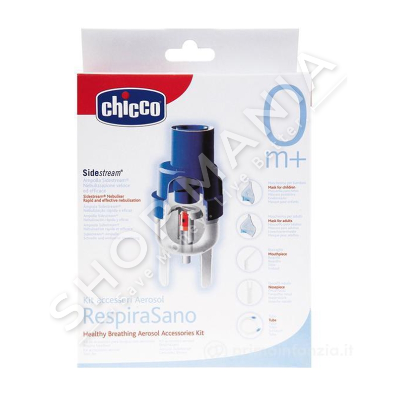 Kiti per aerosolin Respirasano, vjen ne paketim me nje maske per adulte, nje maske per femije, aksesore nderrimi per hunden dhe gojen, nje ampule "Sidestream" dhe nje tub nderlidhes.