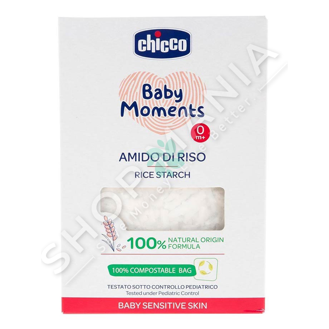 Përshkrimi: Niseshte orizi "Chicco - Baby Moments Rice Starch" eshte ideale per te pastruar lekuren e skuqur te foshnjes dhe per te eliminuar djersen dhe sebumin e tepert.