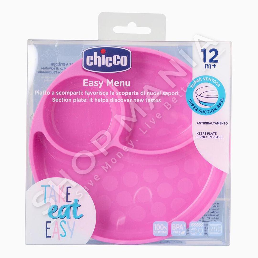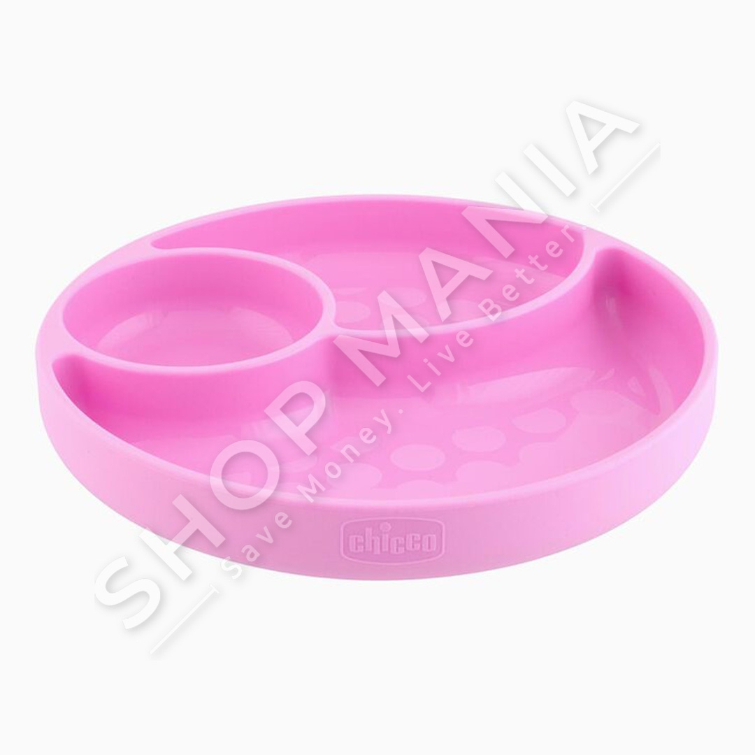 Përshkrimi: Qe vogelushet ta shijojne kohen e ushqimit dhe mos te merziten, ju nevojitet pjata me 3 ndarje "Chicco - Silicone divided plate with sections Eat Easy Pink".