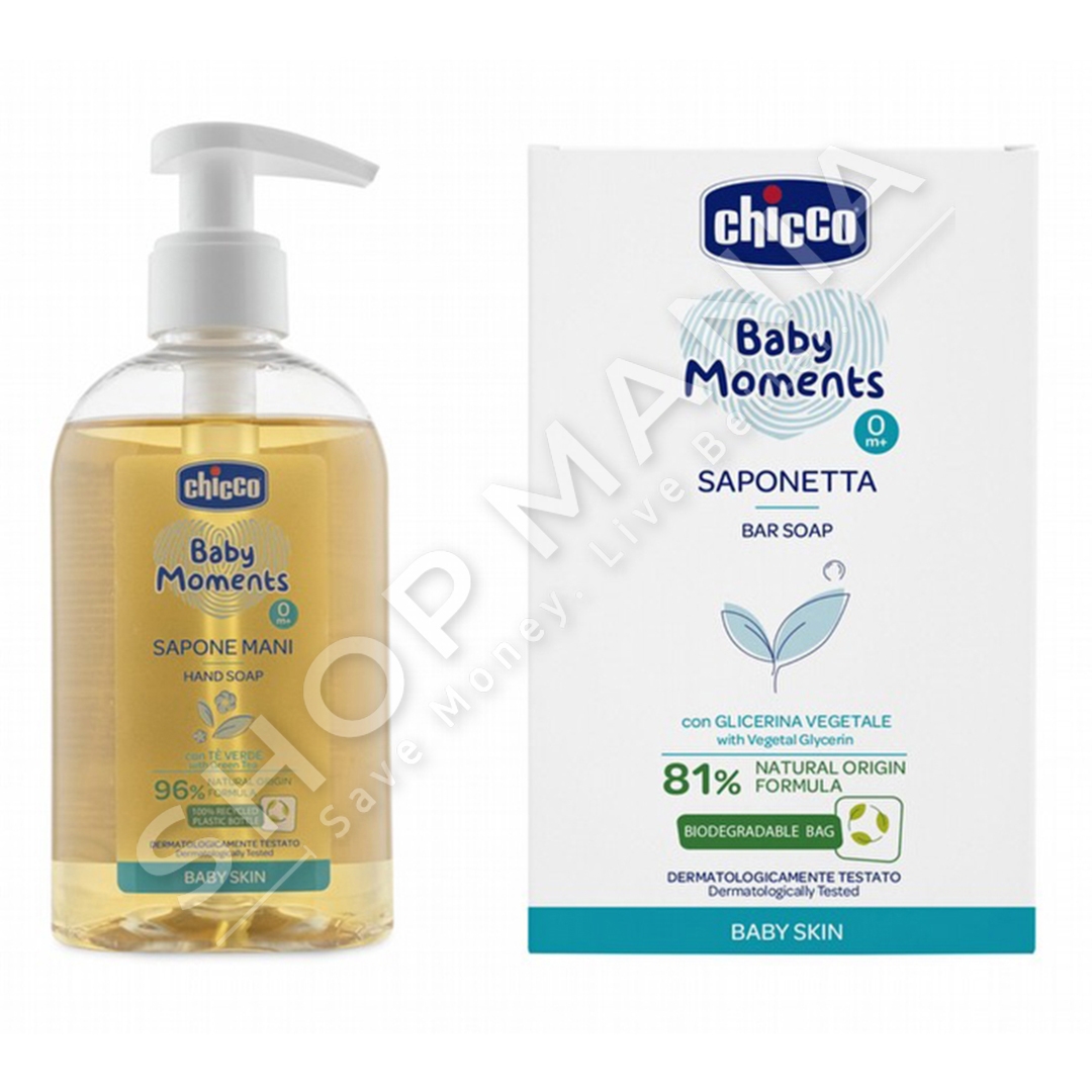 Përshkrimi:Sapun i lengshem per duart "Chicco - Baby Moments Hand Soap" e pasur me caj jeshil antibakterial dhe glicerine bimore.