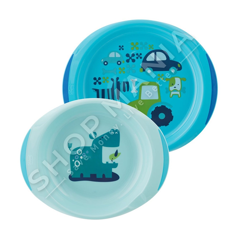 Set pjatash per femije qe perfshin nje pjate te rrafshet dhe nje pjate supe.