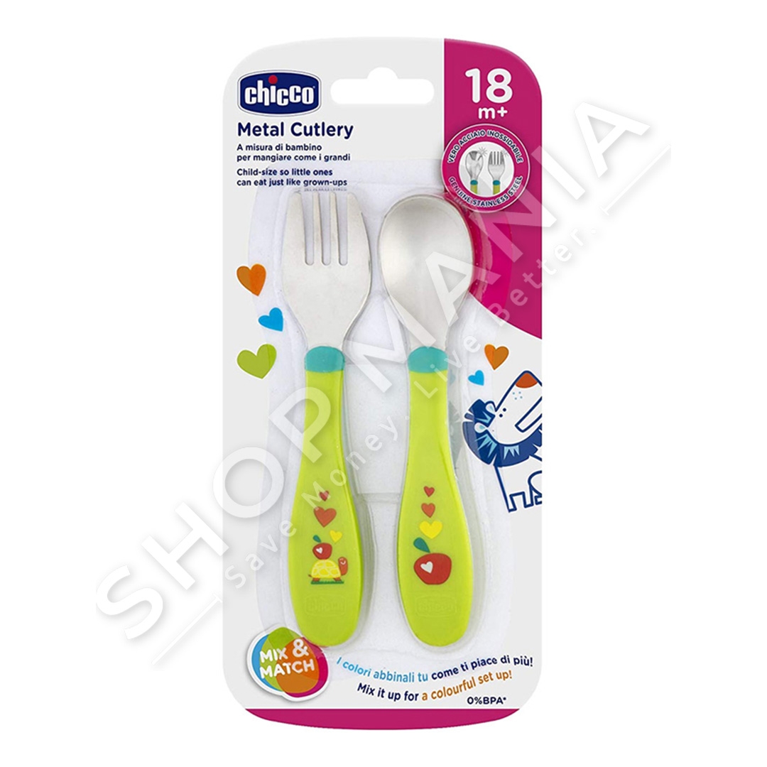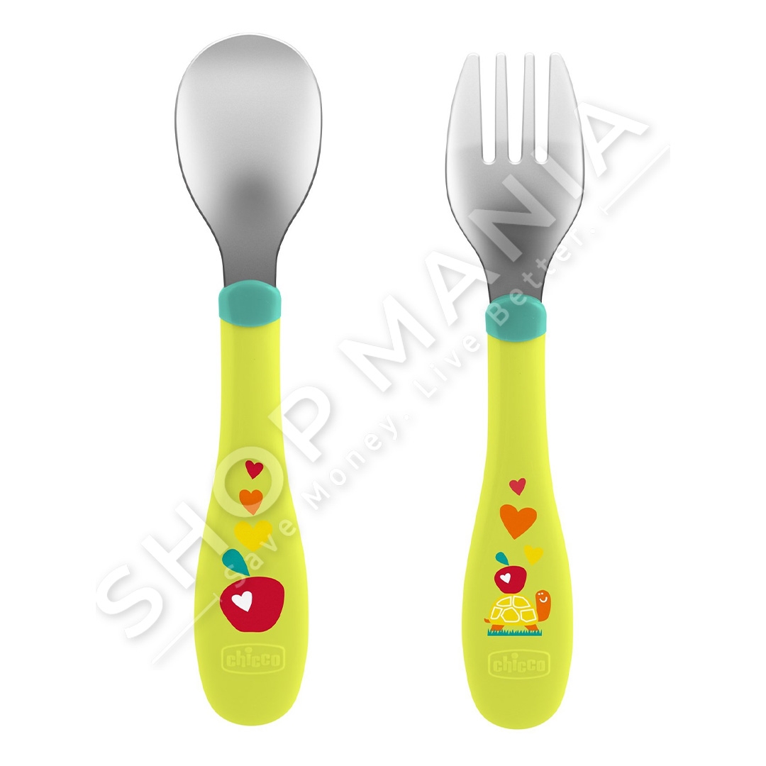 Përshkrimi:Set servisi luge+pirun "Chicco - Metal Cutlery Neutral" per femije +18 muajsh.