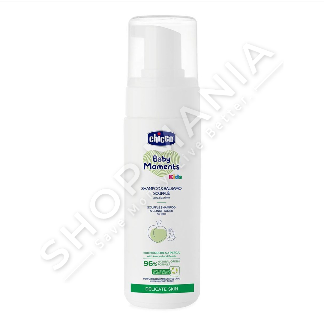 Përshkrimi: Shampo dhe balsam "Chicco - Baby Moments Souffle Shampoo & Conditioner" 2 ne 1 me nje teksture te kendshme qe i le floket te bute dhe me shkelqim.