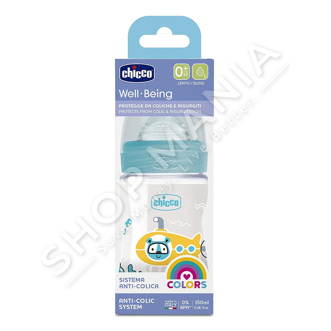 CHICCO - SHISHE ME BIBERON SILIKONI 150ML/+0MUAJSH "FEEDING BOTTLE BABY WELLNESS SLOW PLASTIC FLOW" - 8058664129454
