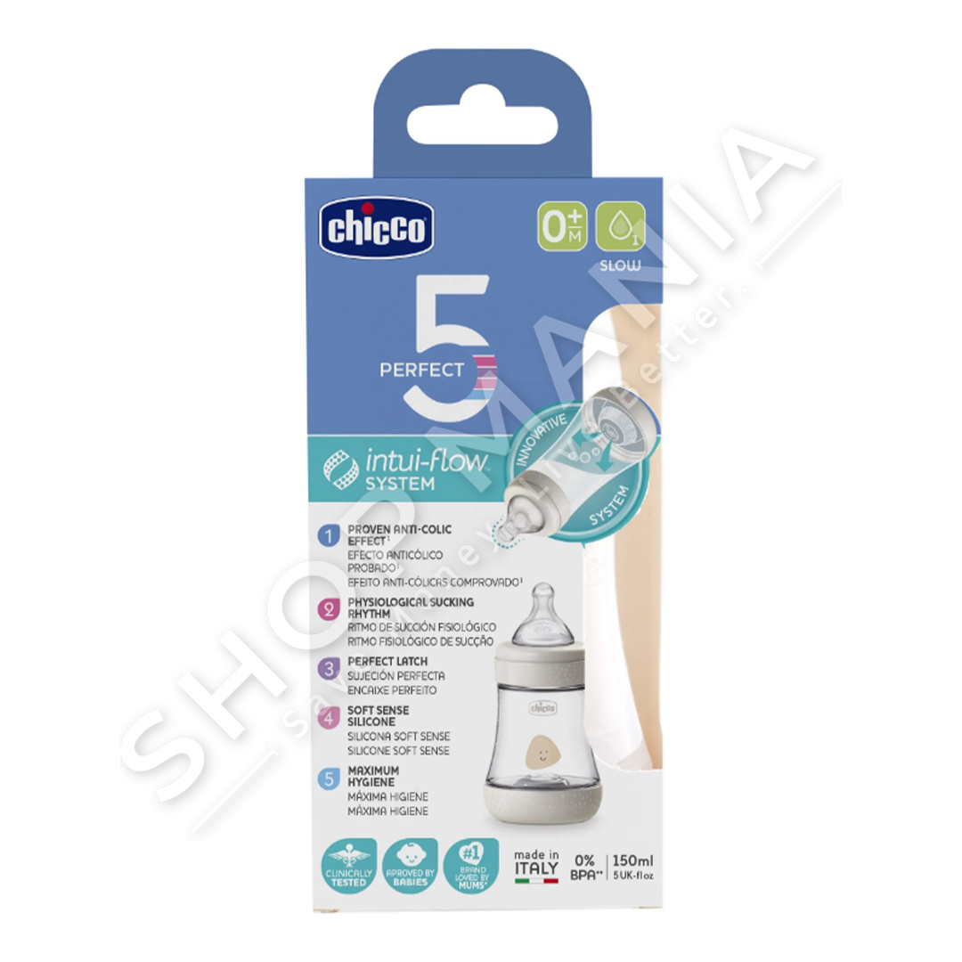 CHICCO - SHISHE ME BIBERON SILIKONI 150ML/+0MUAJSH "FEEDING BOTTLE PERFECT 5 INTUI-FLOW" - 8058664121953
