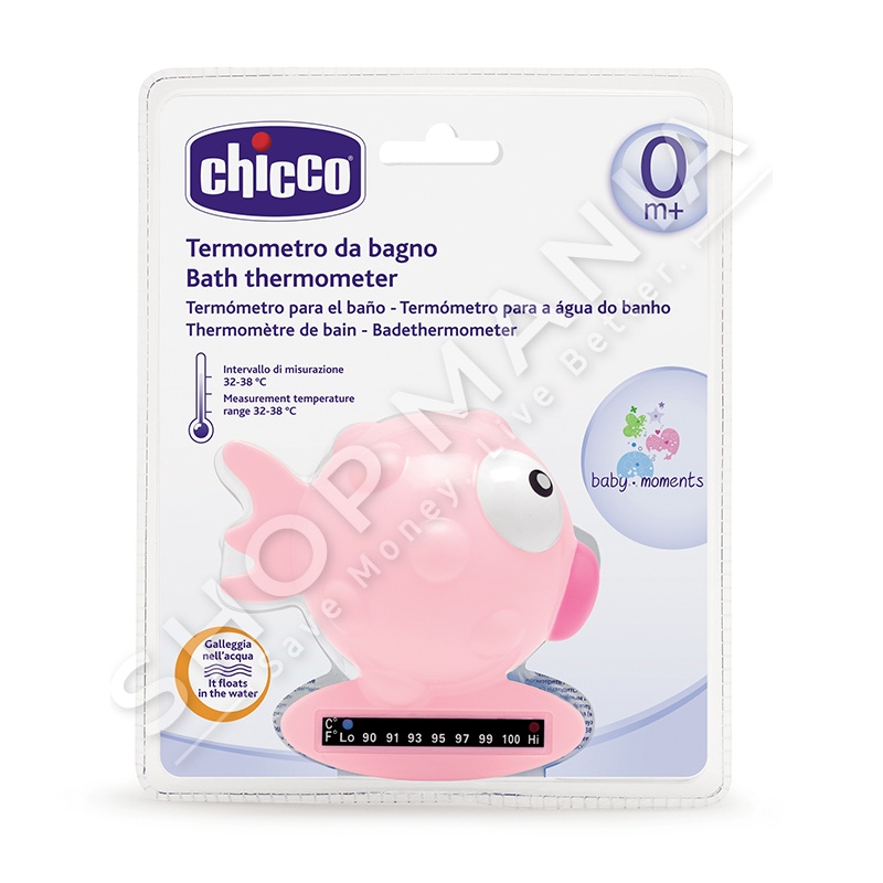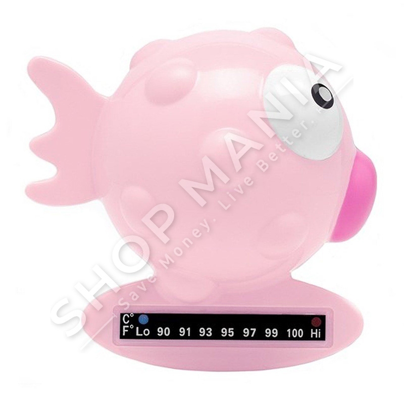 Termometer per banjon e bebeve ne forme peshku me ngjyre roze, qendron mbi uje duke perbere keshtu dhe nje loder argetuese per femijen.