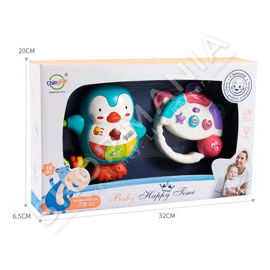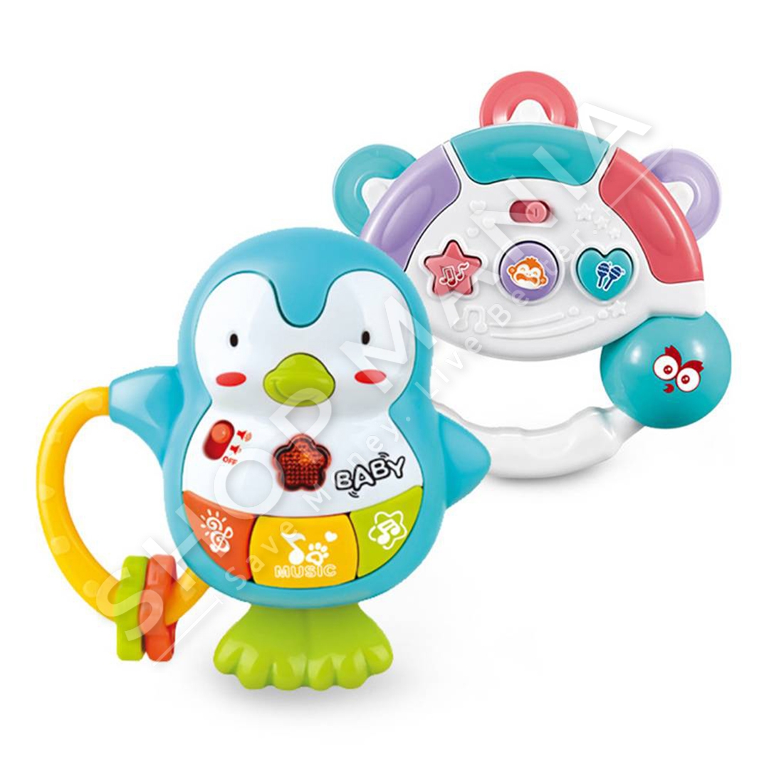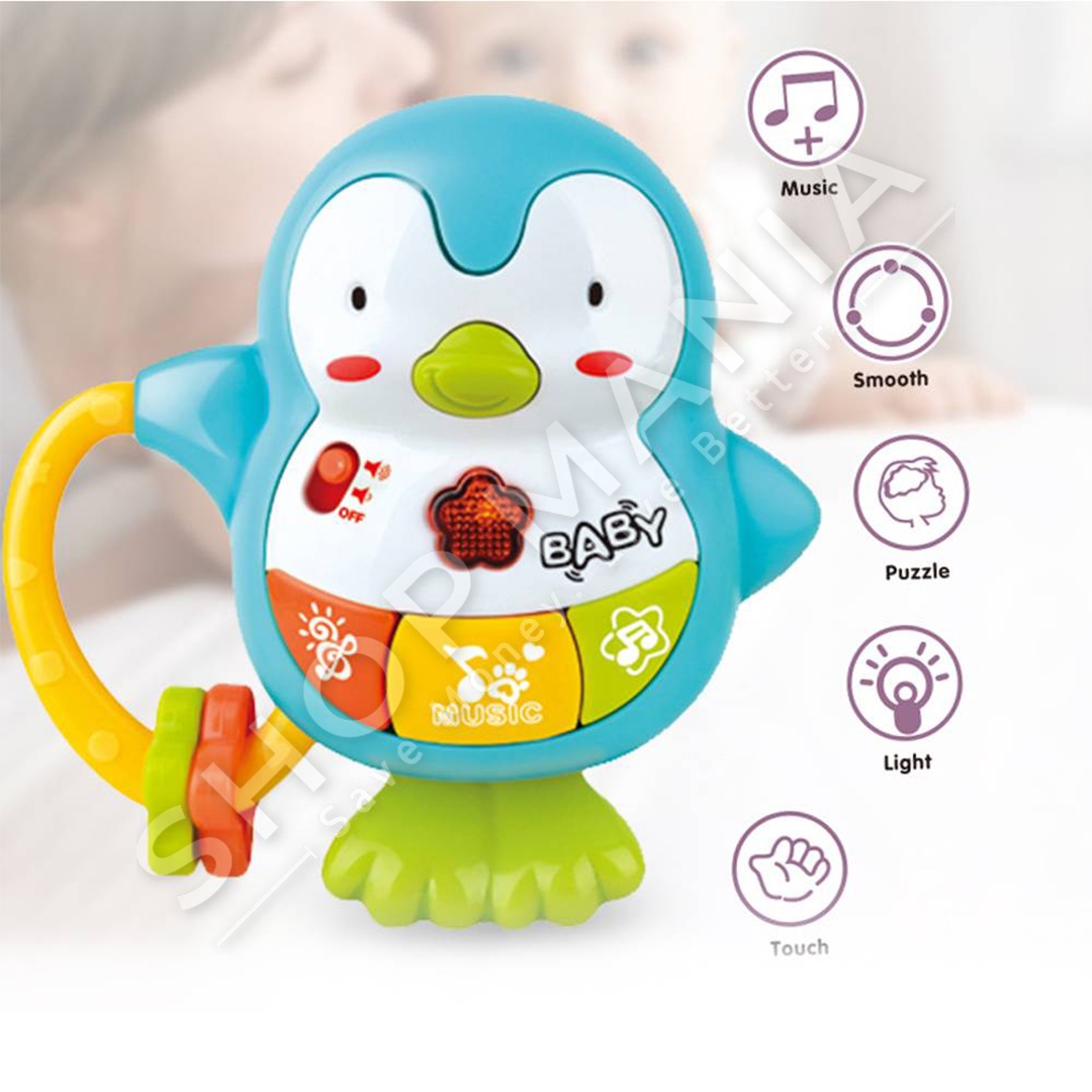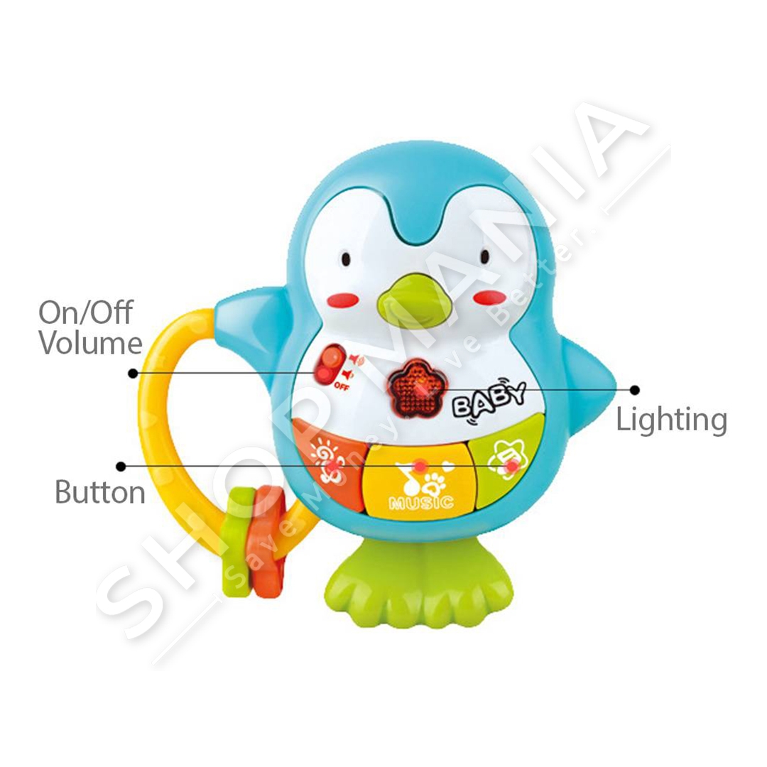 Pinguini ka 3 butona qe do ta ndihmojne foshnjen te mesojë emrat e kafsheve, tingujt, ngjyrat dhe numrat.