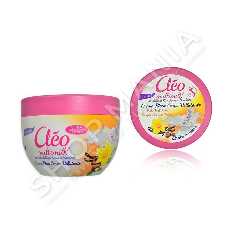 Cleo Multimilk, eshte nje krem trupi me arome shume qetesuese, te nxehte, latine, joshese me zemren e drurit te sandalit, bazes se kedrit dhe vaniljes si dhe me nje prekje te bajames e lajthise.