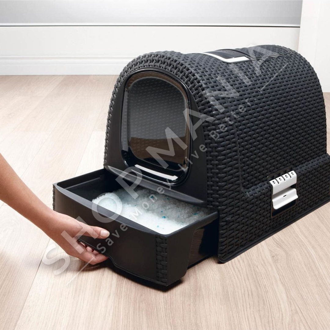 E pajisur me filter karboni qe parandalon daljen e aromave te keqija dhe me nje tapet qe pastron kembet e kafshes nga papastertite.