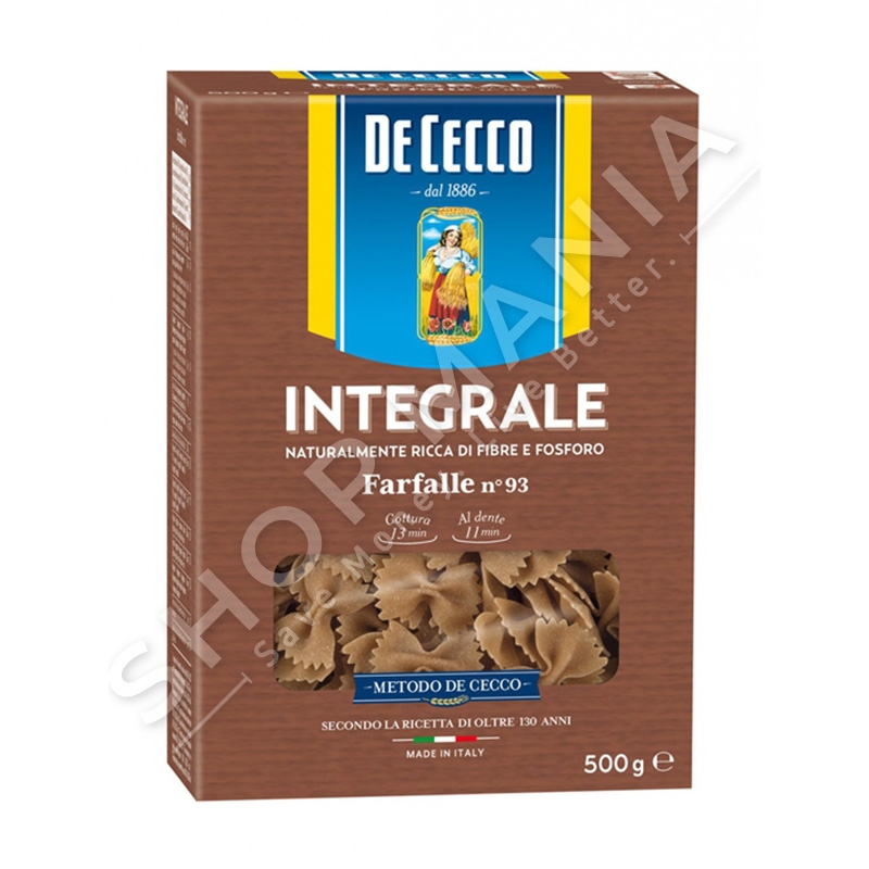 Pergatitur sipas metodes tradicionale De Cecco, 125 vjecare. Lloj miellit: semolina 100%. Integrale 100%. Varieteti me i mir i miellit italian dhe atij amerikan. Pa OMGJ. Thare ne temperature te ulet. Pesha: 500gr