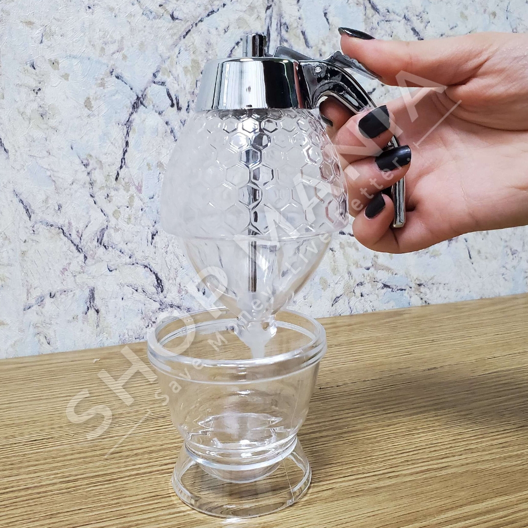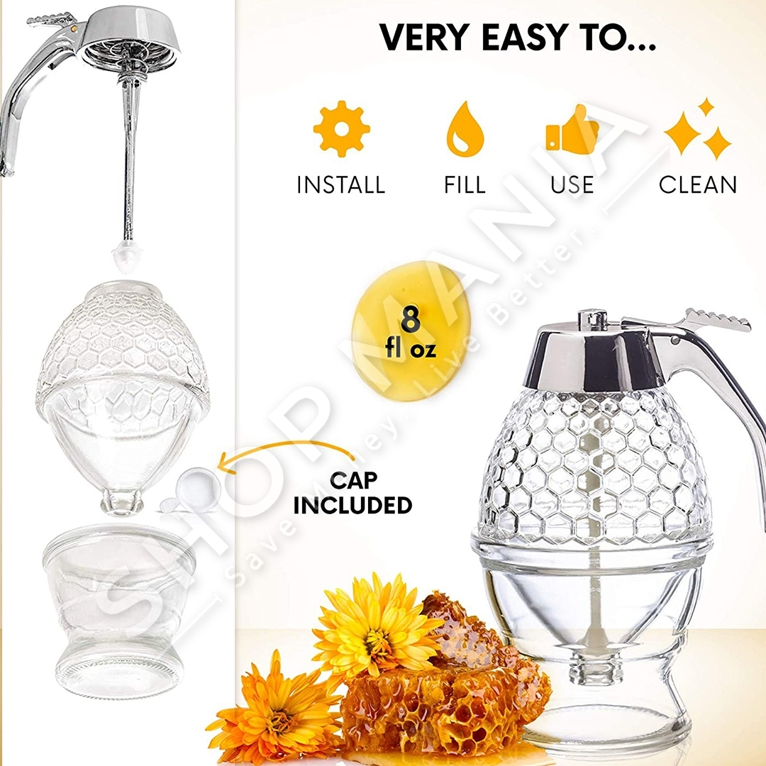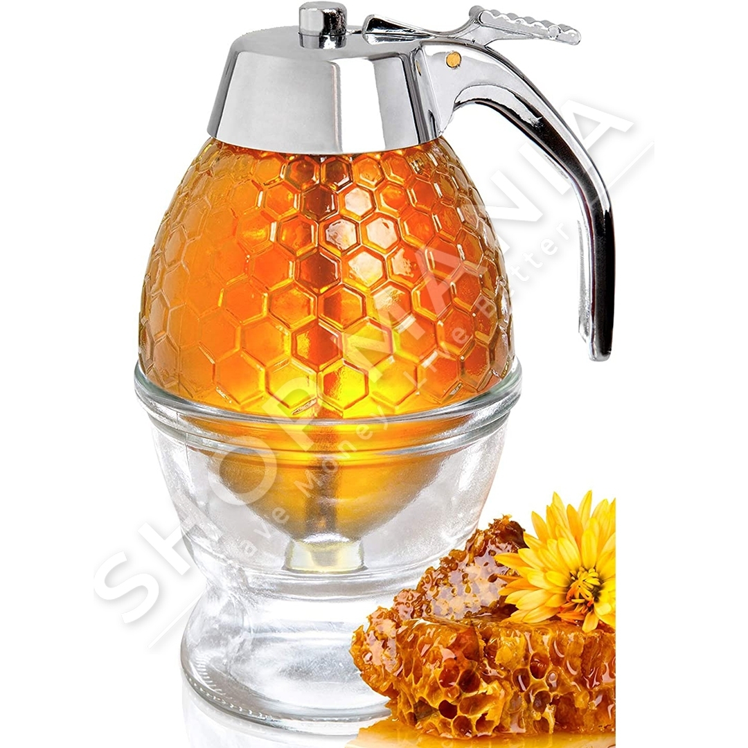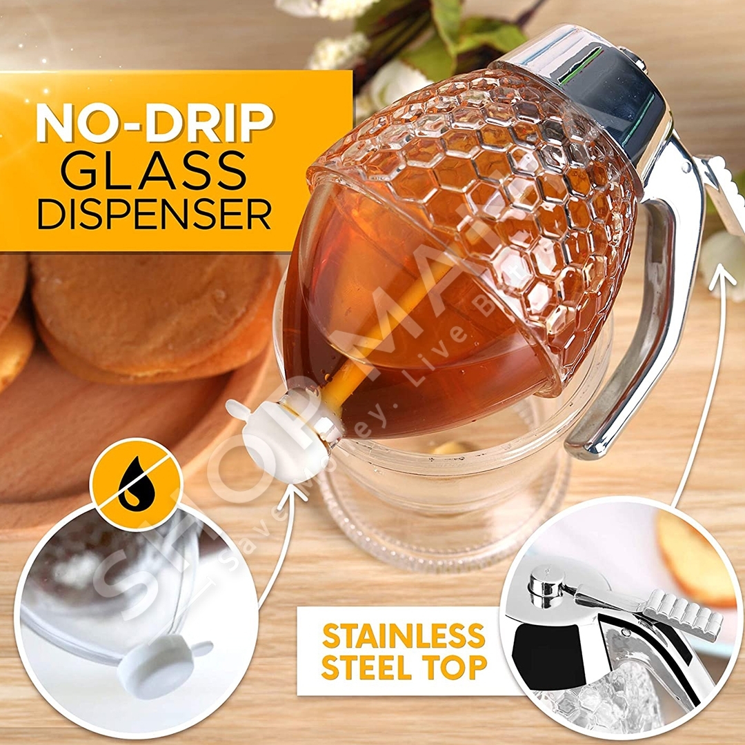 Dispenser per mjaltin "Honey Dispenser No Drip Glass with Stainless Steel Top - Syrup Dispenser Glass - Beautiful Honey Pot - Honey Jar with Stand" i nevojshem per t'u pasur ne kuzhine.