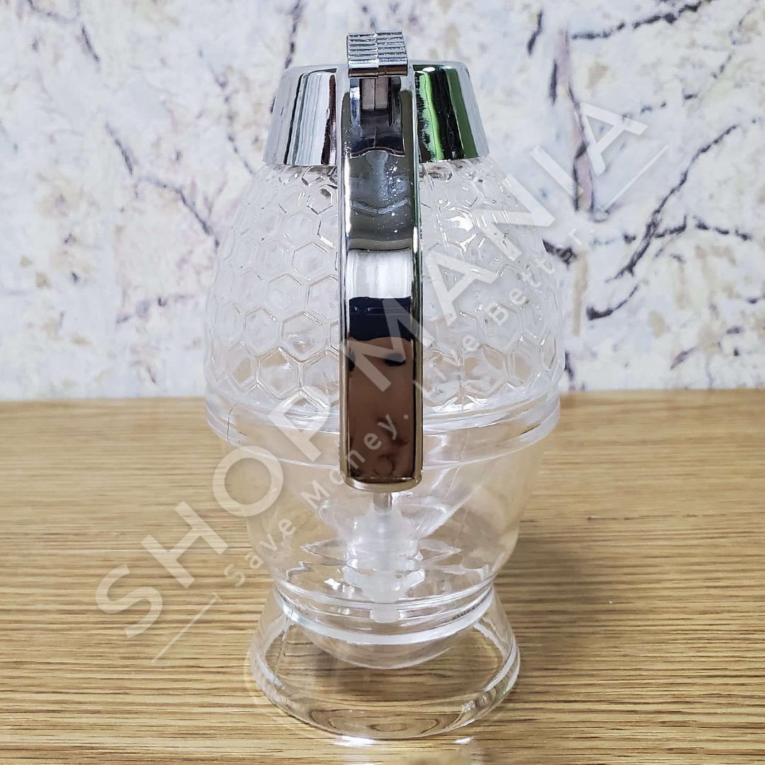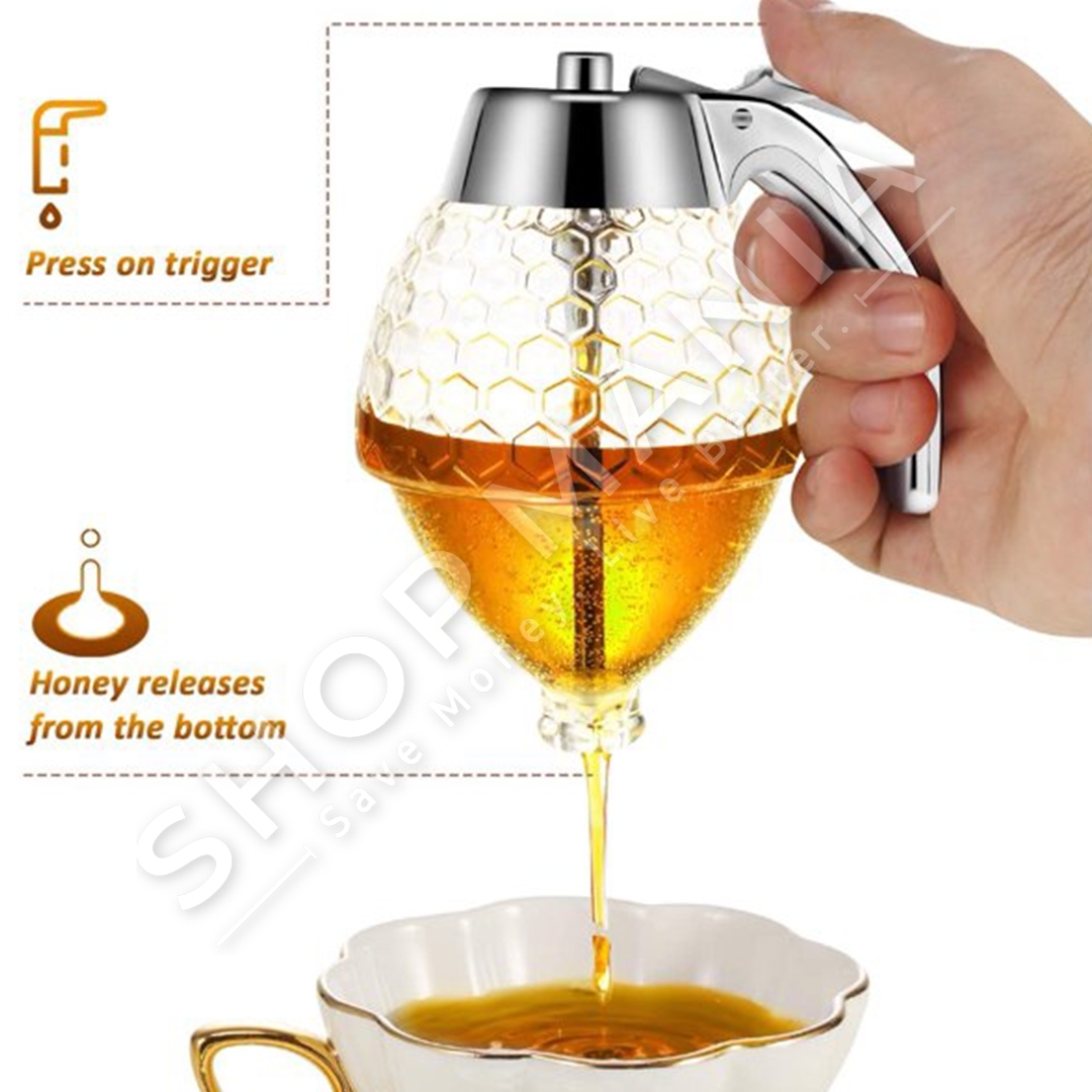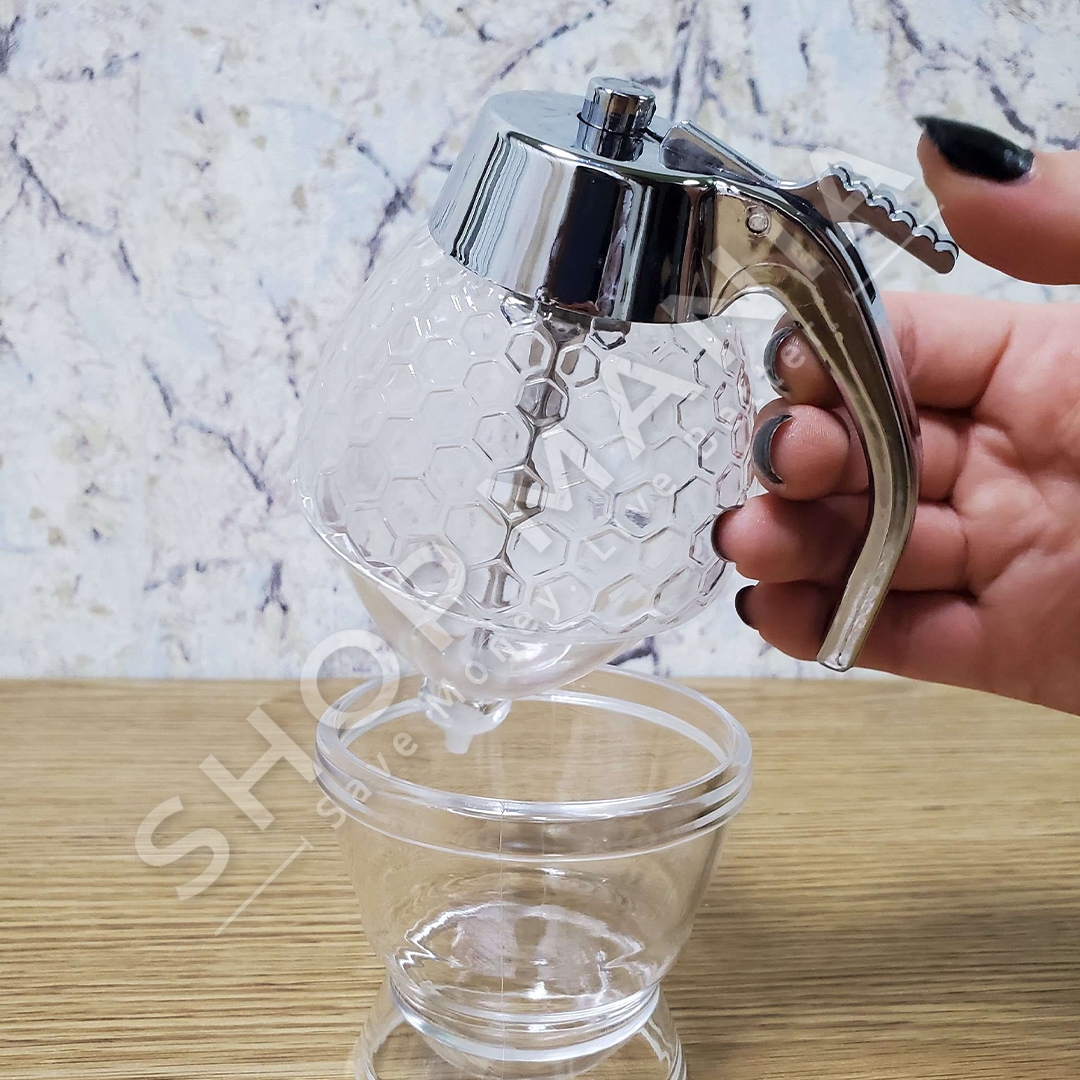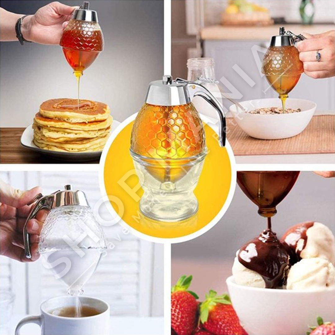 Dispenser per mjaltin "Honey Dispenser No Drip Glass with Stainless Steel Top - Syrup Dispenser Glass - Beautiful Honey Pot - Honey Jar with Stand" i nevojshem per t'u pasur ne kuzhine.