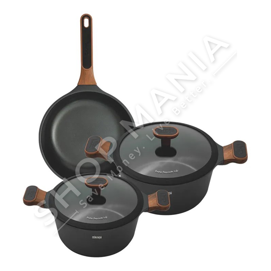 Seti i kuzhinës me veshje guri CA009-S02 nga DSP është një set kuzhine shumë funksional i përbërë nga dy tenxhere dhe një tigan. Me veshjen e tyre të gurit, këto enë kuzhine kanë një pamje të veçantë, e cila i jep një prekje elegante kuzhinës tuaj.
