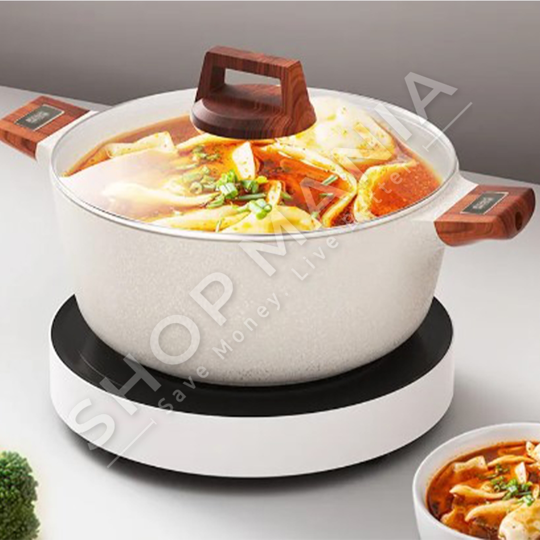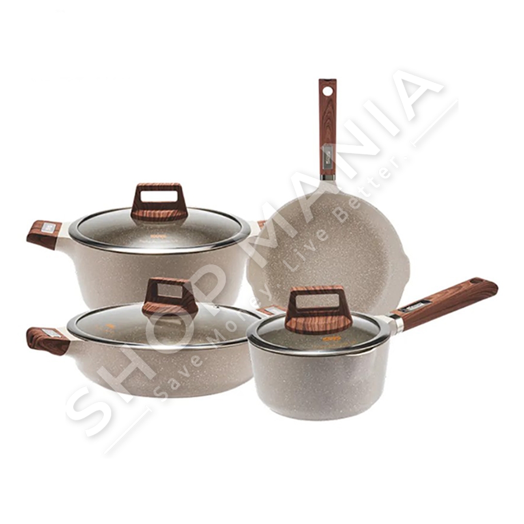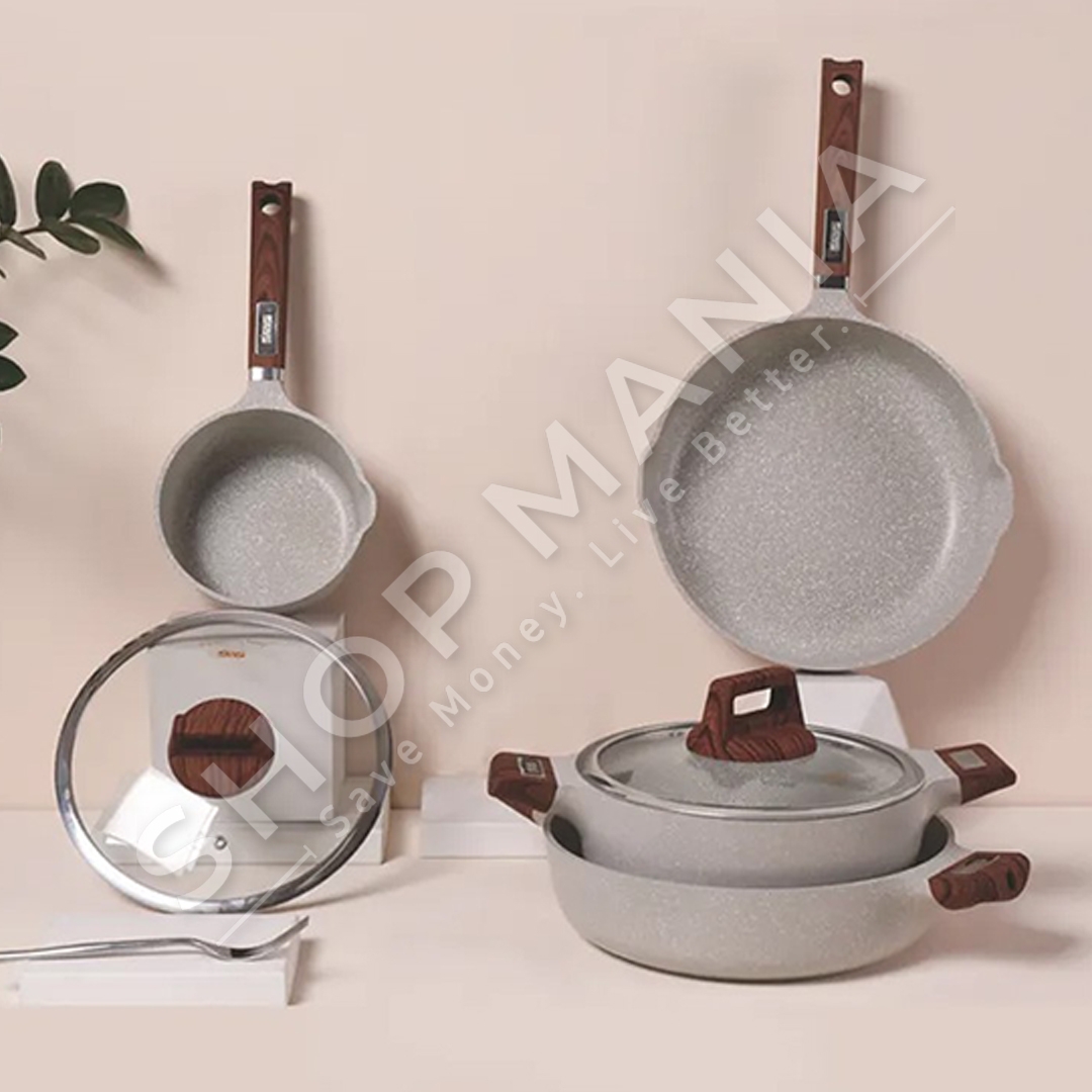 Seti i kuzhinës me veshje guri nga DSP është një set i mrekullueshëm i përbërë nga dy tiganë dhe dy tenxhere, të projektuar për krijimin e vakteve të shijshëm dhe në frymën e një kuzhine profesionale.