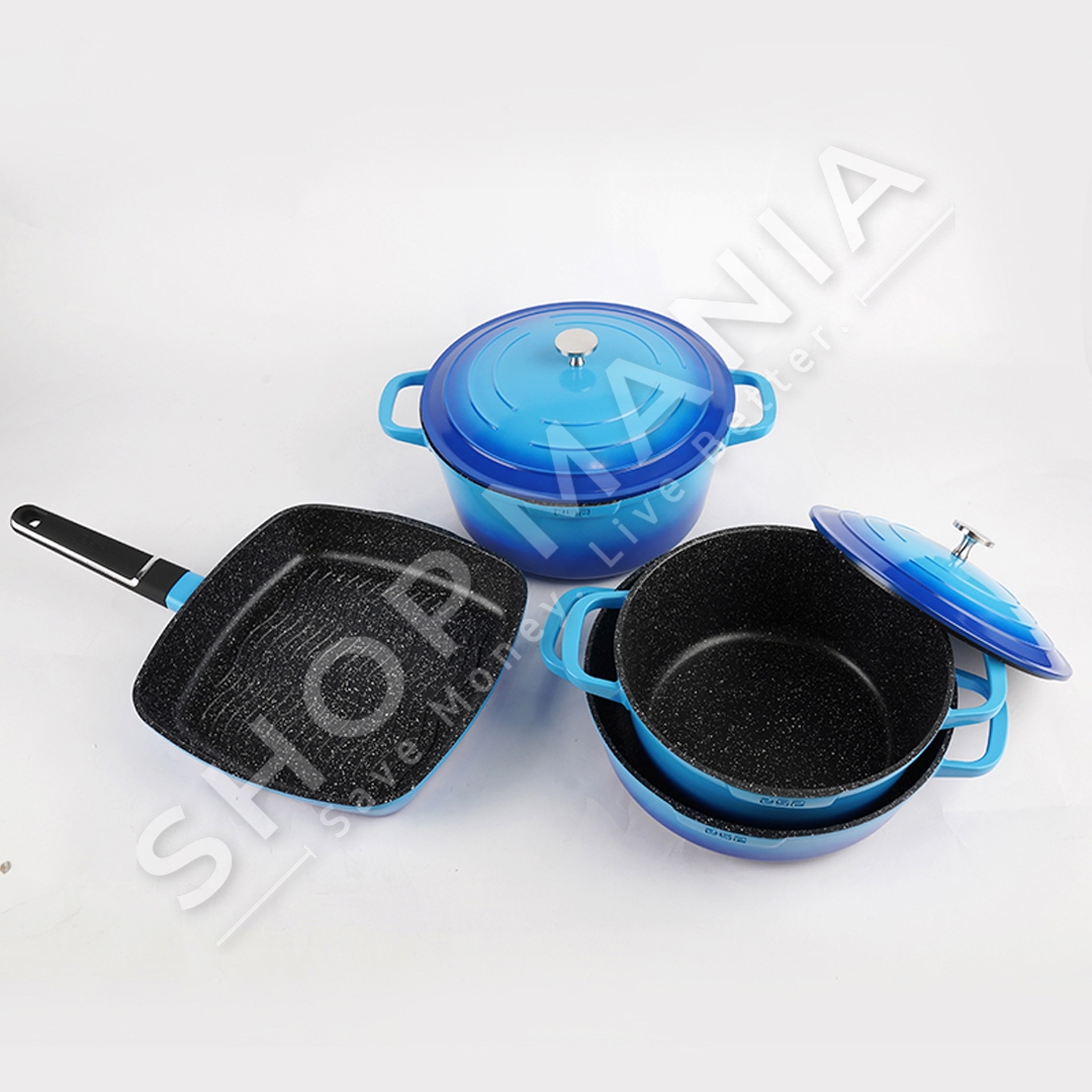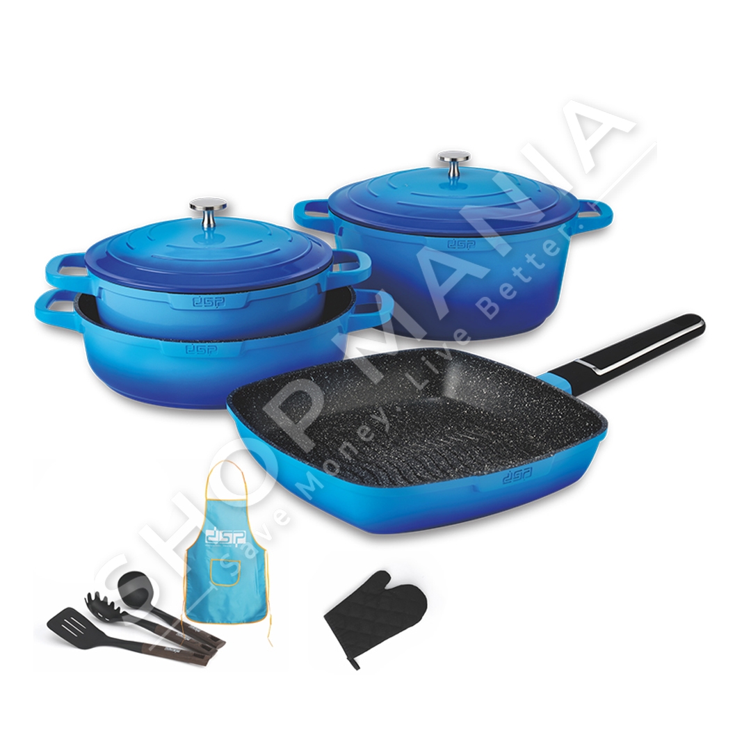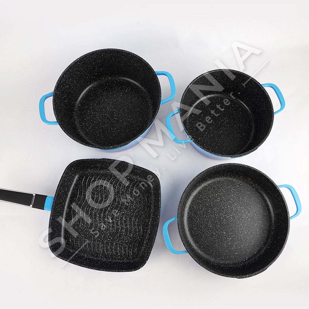 Seti i kuzhinës CA013-S01 nga DSP është një set i shkëlqyeshëm dhe i sofistikuar me veshje guri, i përbërë nga tre tenxhere dhe një tigan në formë katrore. Veshja me gur e bën këtë set të dallohet nga setet e tjera dhe i jep një pamje elegante dhe moderne kuzhinës tuaj.
