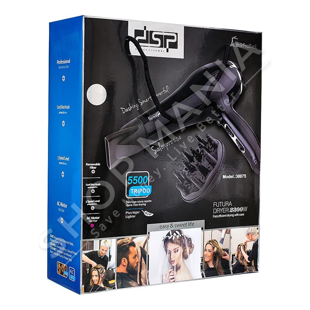 Electric Hair Dryer 30075 nga marka DSP është një pajisje profesionale për tharjen e flokëve. Me fuqinë e saj prej 2300W, ajo ofron shpejtësi dhe efikasitet në tharjen e flokëve. Ky model ka një buton për ajër të ftohtë, duke u bërë i përshtatshëm për të rregulluar flokët pa i dëmtuar ato.