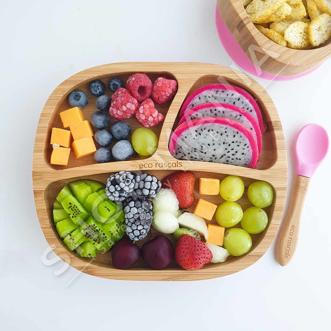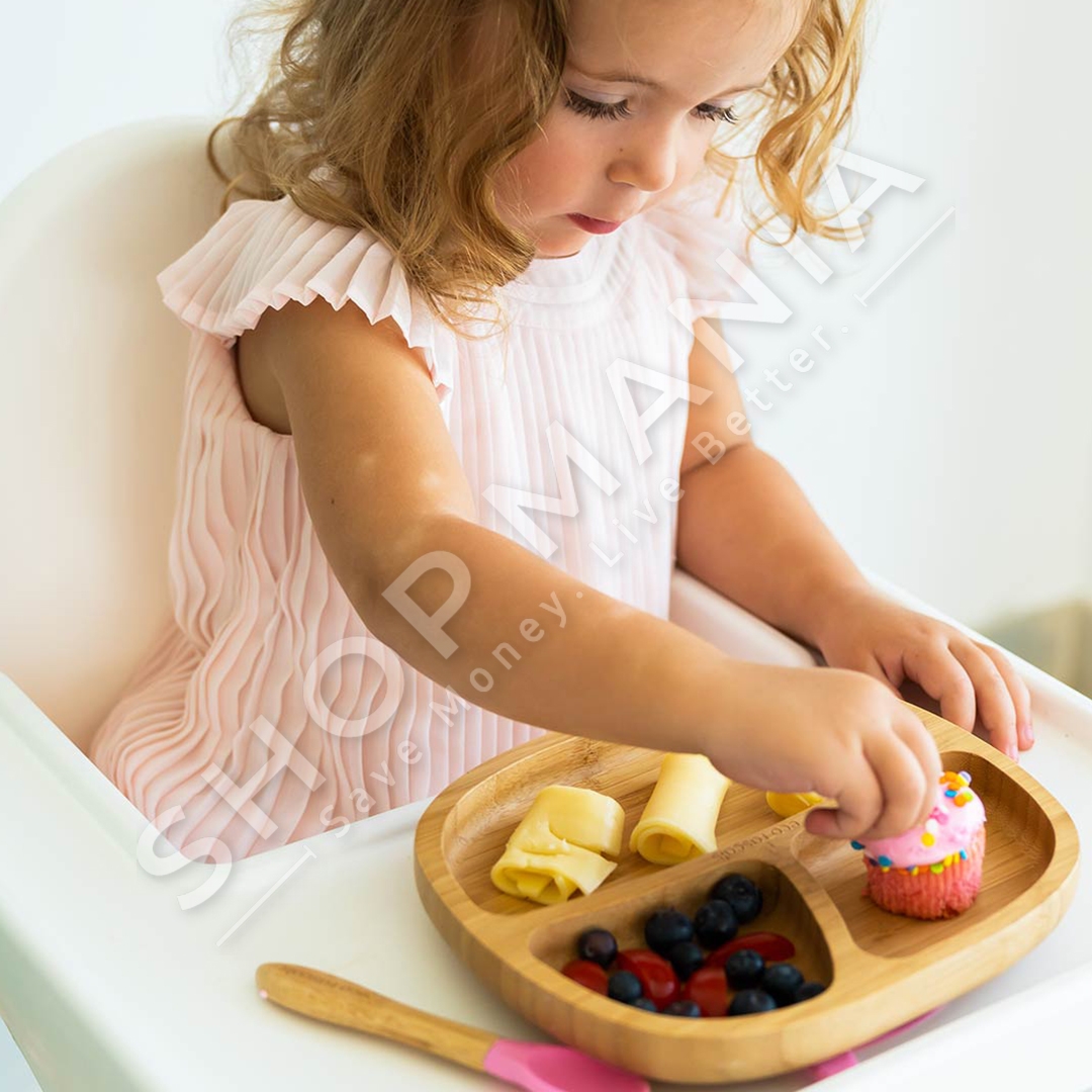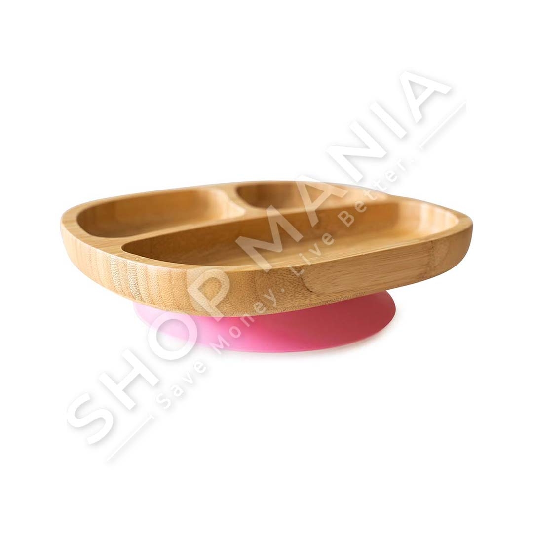 Përshkrimi: Qe vogelushet ta shijojne kohen e ushqimit dhe mos te merziten, ju nevojitet pjata me 3 ndarje prej bambuje dhe baze silikoni te shkeputshme ngjyre roze.
