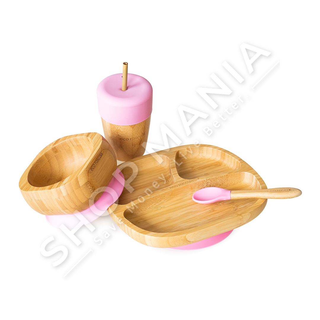 Seti permban: 1 pjate bambuje me 3 ndarje dhe baze silikoni ngjyre roze, 1 tas bambuje me baze silikoni ngjyre roze, 1 gote bambuje me kapak silikoni, 2 pipeza bambuje dhe 1 luge me maje silikoni.