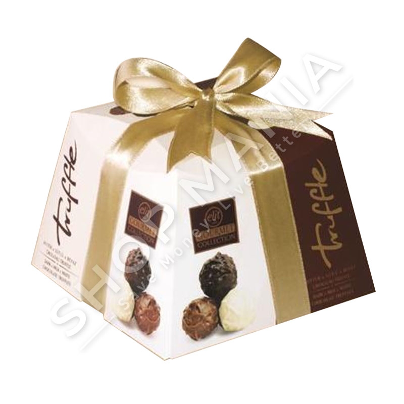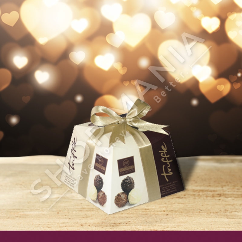 Cokollata truffle me cokollate te bardhe, te zeze dhe me qumesht te mbuluara me krem karamel dhe me krem qershi.