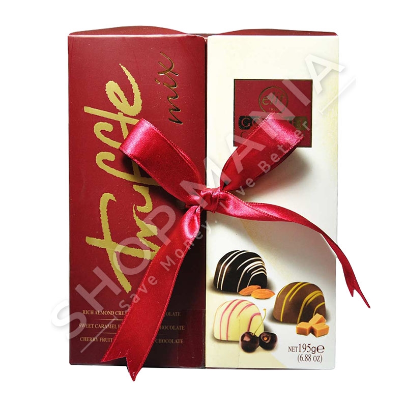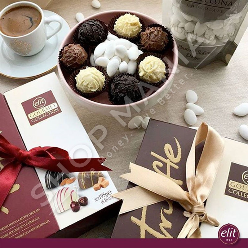 Cokollata truffle me cokollate te bardhe, te zeze dhe me qumesht te mbuluara me krem karamel dhe me krem qershi.