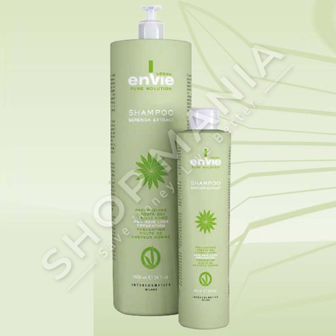 Shampo vegane Envie Vegan Men's Hair Loss per floke te dobet te meshkujve dhe te prirur drejt renies. Formula e saj permban vajra dhe ekstrakte bimore te Serenoa, Camellia Japoneze, Baobab, Black Cohosh dhe Ginko Biloba. Keto stimulojne mikroqarkullimin e lekures, duke favorizuar oksigjenimin dhe duke forcuar skalpin.