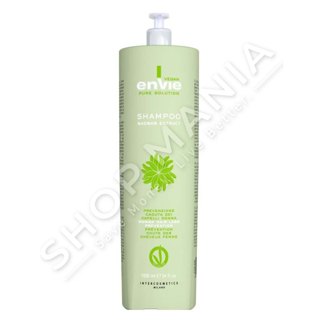 Shampo vegane Envie Vegan Women's Hair Loss per floke te dobet dhe te prirur drejt renies. Formula e saj perbehet nga perberes aktive natyrale, si: vajra dhe ekstrakte bimore te Baobab, Kameles Japoneze, Aloe Vera, Hithres, Rozmarines, Livandes dhe nenexhikut, te cilet ndihmojne rritjen e flokeve duke forcuar strukturen e tyre dhe duke i lene ato me shkelqim dhe te bute.