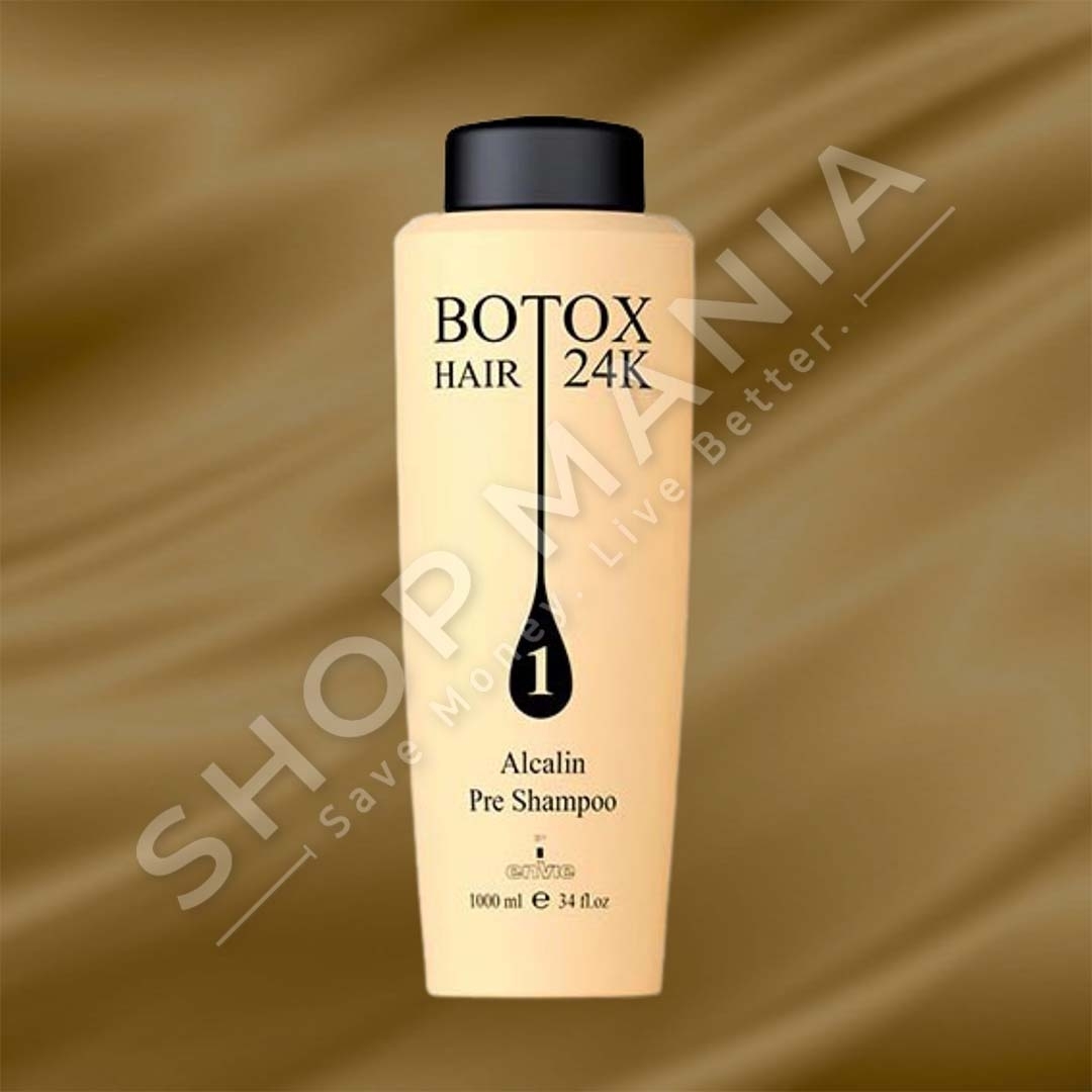 Shampo Envie Botox 24K Alkalin Pre Shampoo pastron ne thellesi dhe pergatit floket per trajtimin Botox Hair 24K. Eshte nje shampo e krijuar per personat qe duan te kujdesen per floket e brishte, te demtuar ose te holle, pasi u jep flokeve +30% volum.