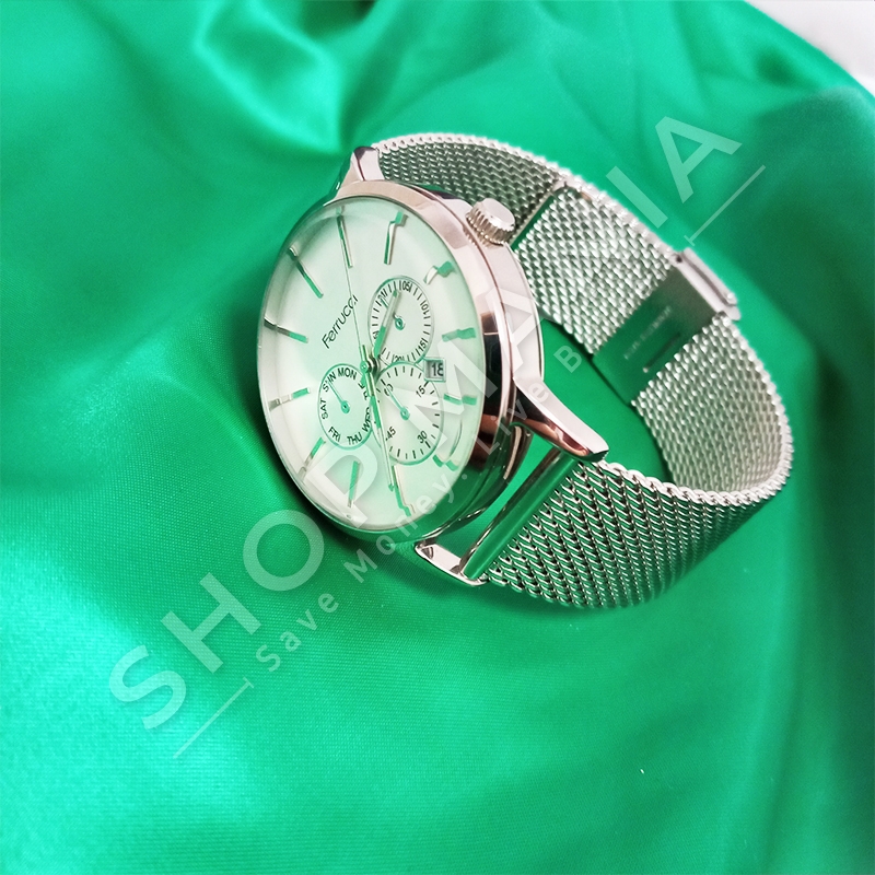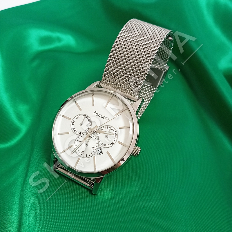Ore per meshkuj nga Ferrucci, me zinxhir, fushe te bardhe dhe tregues date.